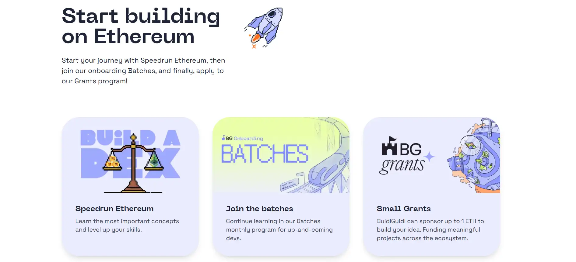 BuidlGuidl is a curated developer community helping to grow the Ethereum ecosystem through education, tooling, mentorship, and funding. The journey begins with Speedrun Ethereum, a guided course for learning smart contract development using Scaffold-ETH. From there, developers can join monthly Batches, submit their own dApps, and even qualify for ETH-based grants known as Builder Streams.