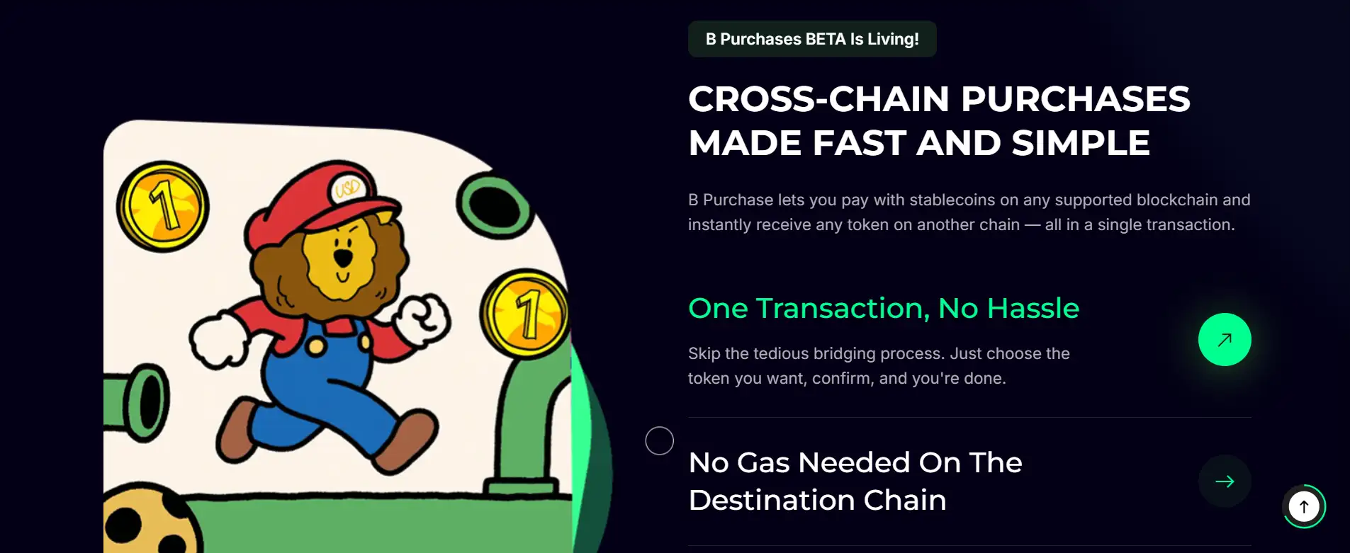 B Purchase eliminates the need for complex bridging and multiple steps by allowing users to pay with any stablecoin on one blockchain and instantly receive any token on another chain in a single transaction. Users on BuildOn benefit from no gas fees on the destination chain, live pricing, and lightning-fast execution, making cross-chain token acquisition seamless.
