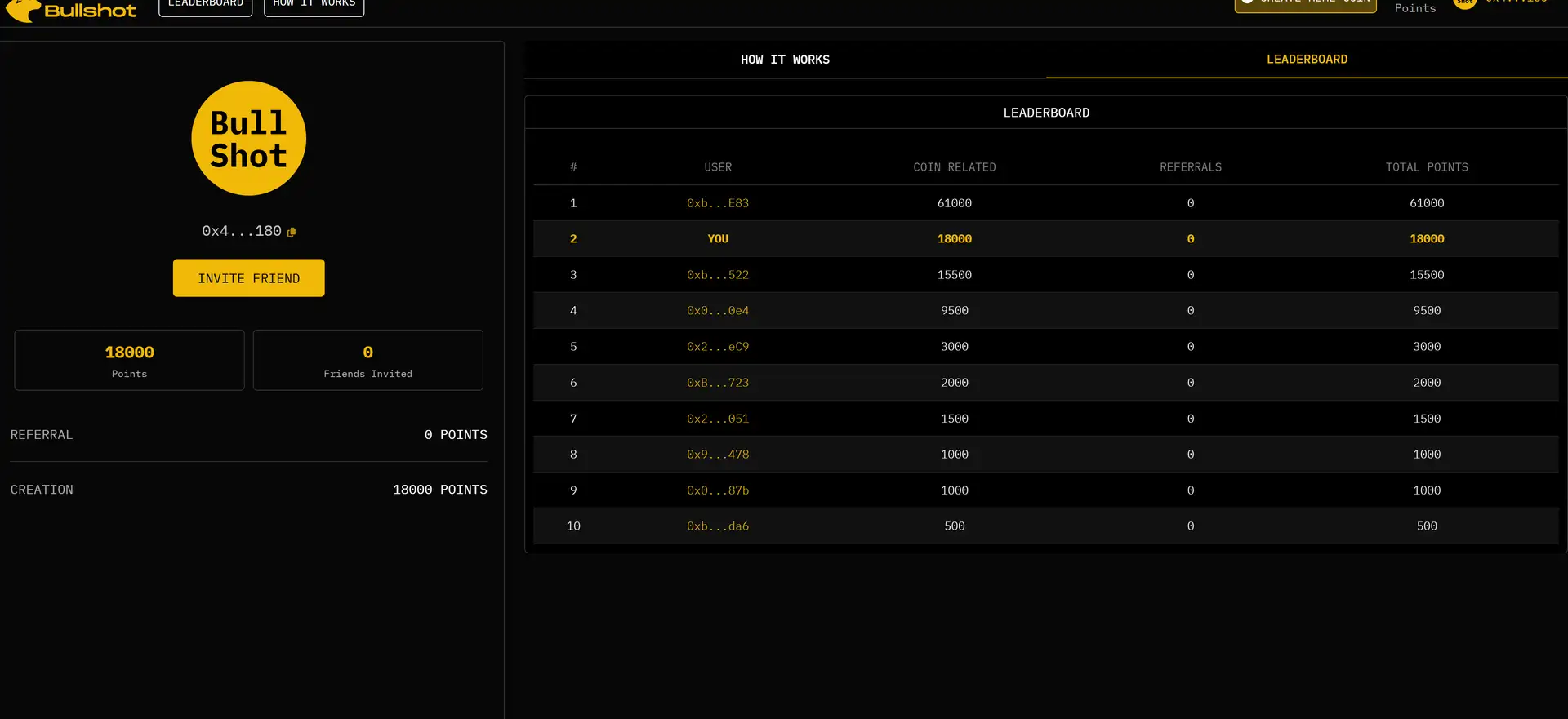 - You earn points on Bullshot by performing key actions. Creating a meme coin gives you 500 points, while sending that coin to a DEX rewards you with 10,000 points. You can also stack even more points by referring friends, who earn you 20% of their point totals. These points help boost your rank on the platform’s leaderboard and bring more visibility to your token.