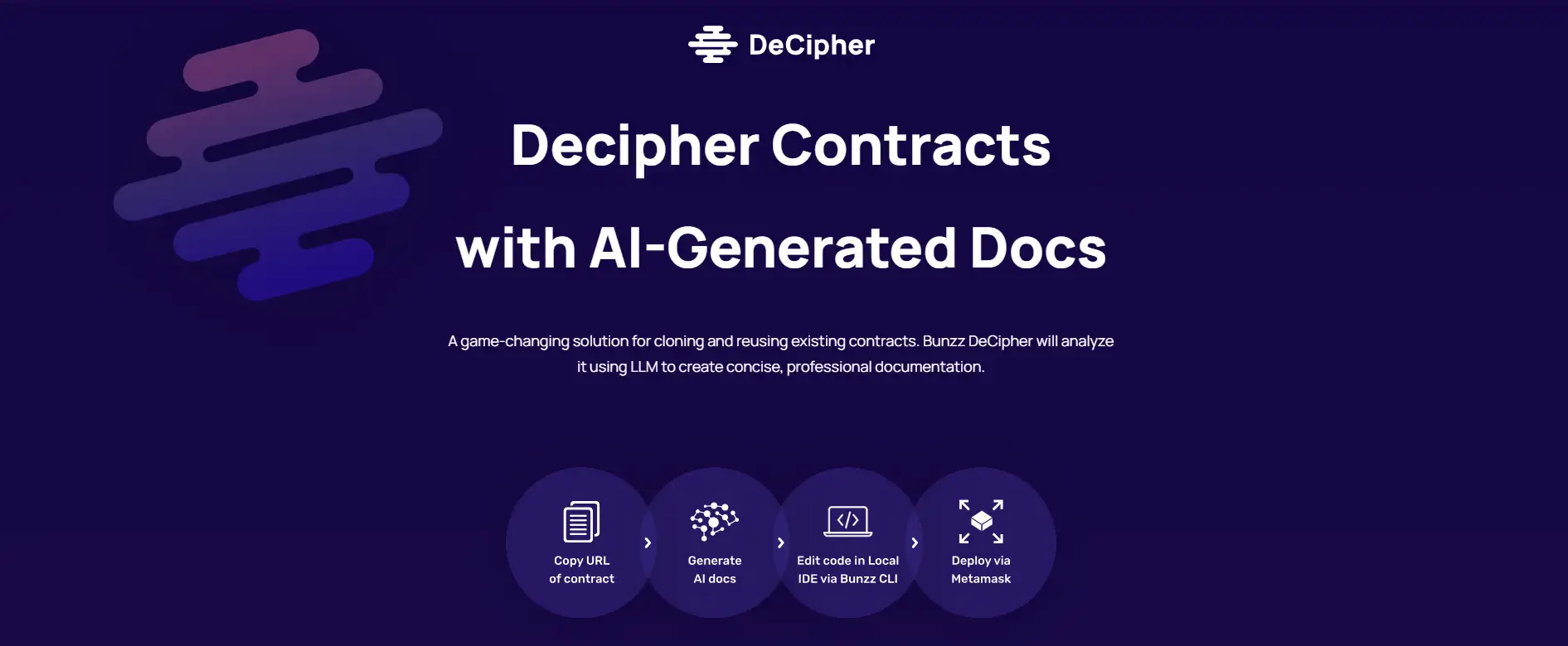 DeCipher is Bunzz’s AI tool that uses LLM technology to analyze and generate clean, concise documentation for any smart contract. This makes it easier to understand, fork, or verify contracts on-chain. Whether you're exploring a third-party NFT contract or customizing DeFi code, DeCipher turns complex code into readable summaries—making transparency a default. Try it at Bunzz.dev.