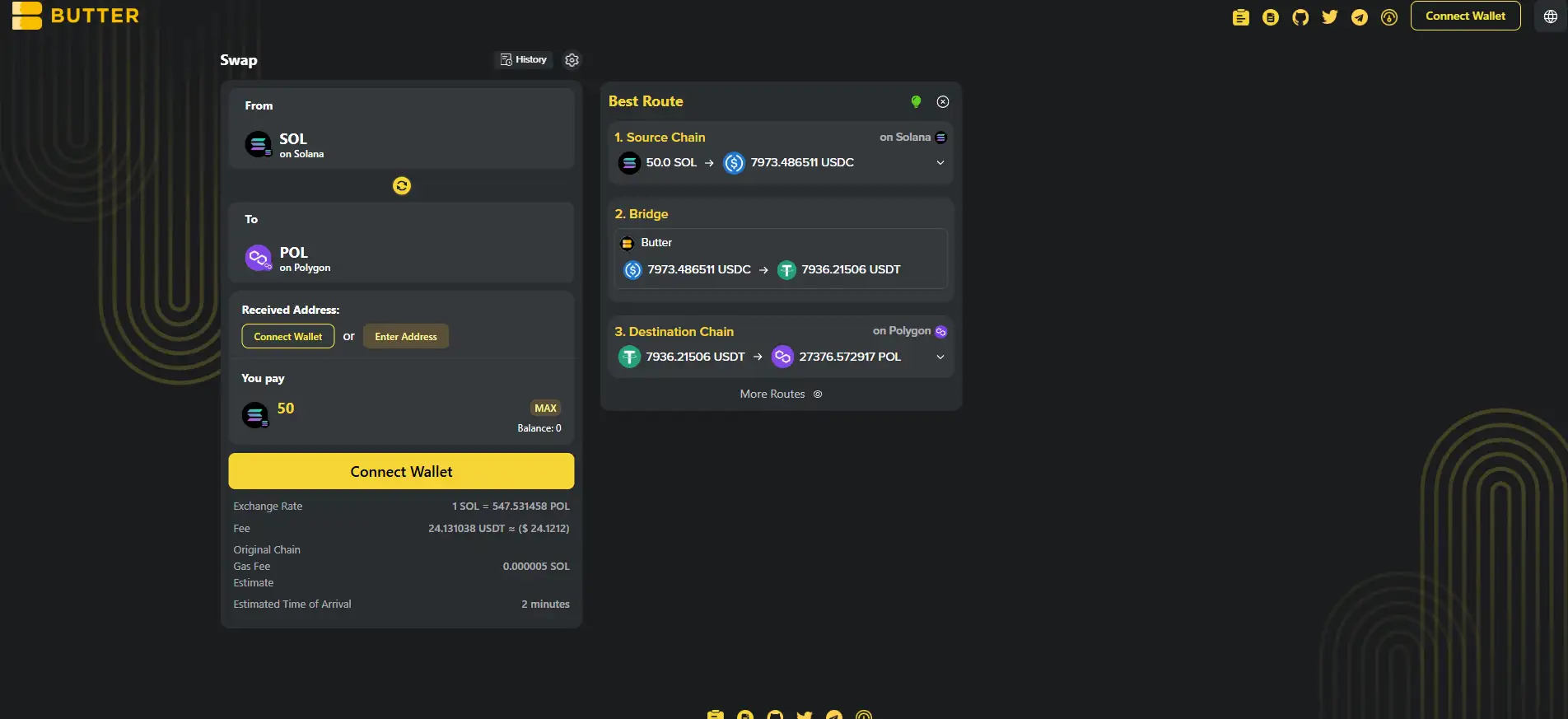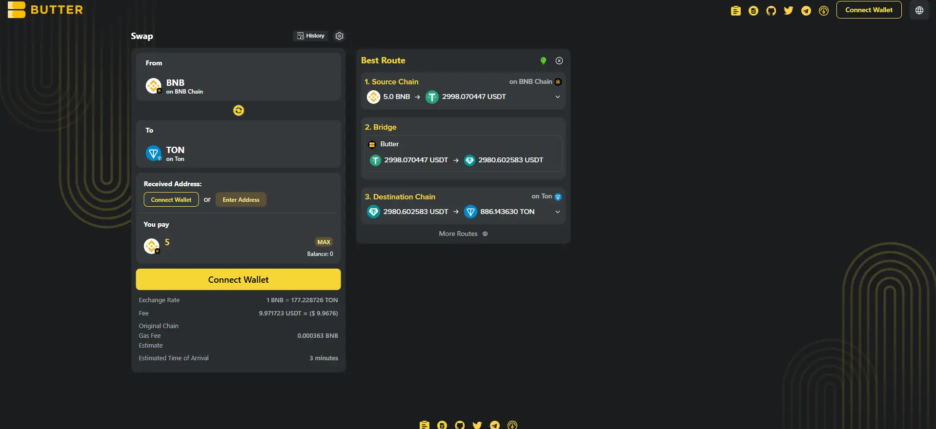 Butter is an Omnichain Interoperability Hub integrated with ZK technology that enables users with global DAPP accessibility and data availability, building an infrastructure that makes transactions transverse across chain to chain freely and securely. It enables seamless swaps across major blockchains, delivers fast trades, robust security, and competitive pricing.