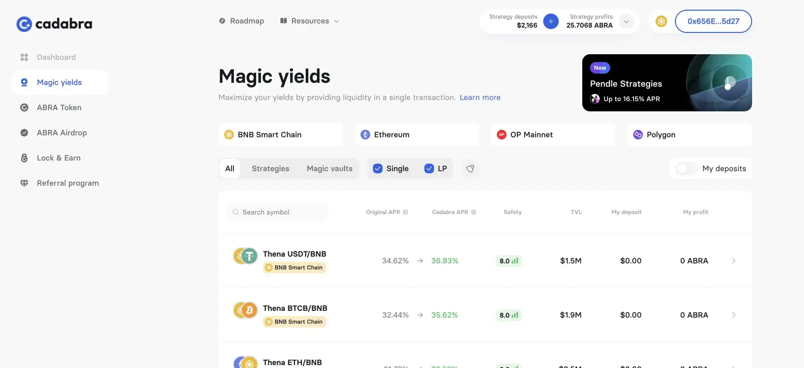 - Explore the automated yield strategies offered by Cadabra, selecting the ones that best fit your risk tolerance and investment goals. Monitor your portfolio and adjust your strategies as needed to optimize your returns.