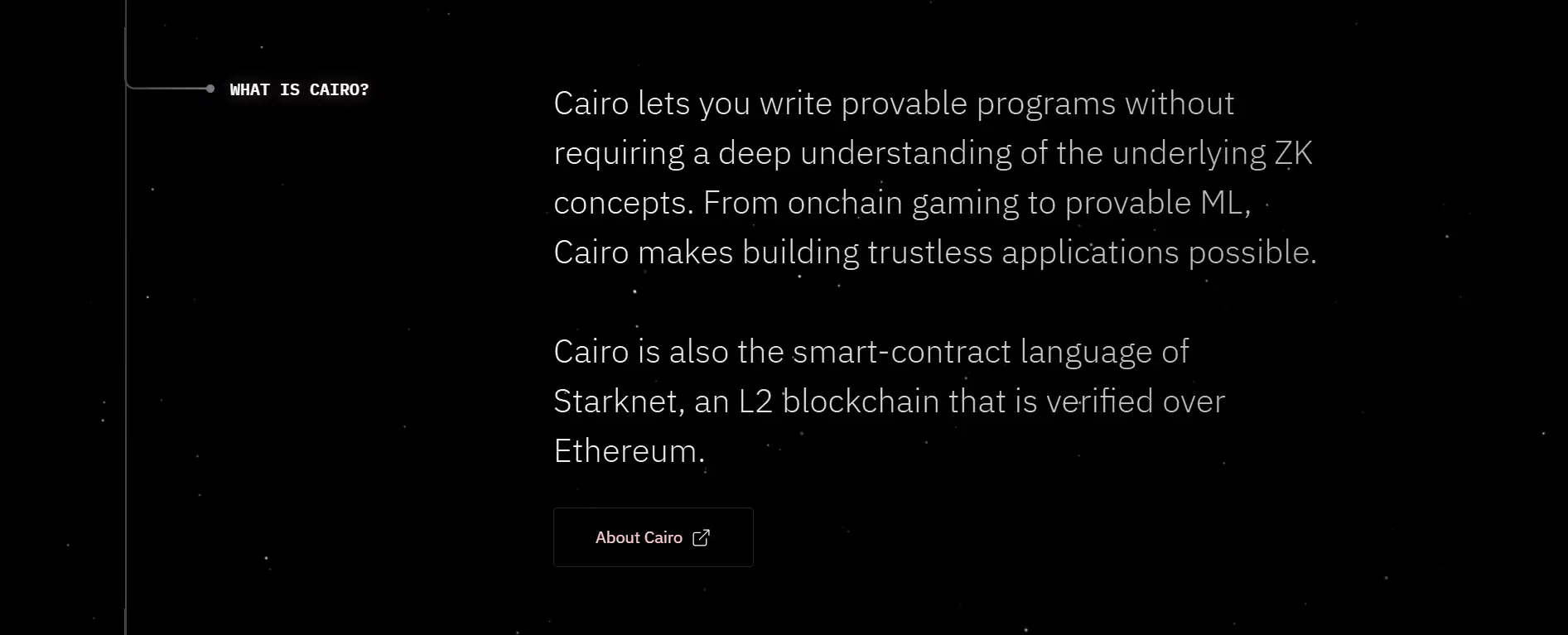 Cairo simplifies zero-knowledge programming by using a Rust-like syntax that abstracts the cryptographic complexity while preserving the ability to write low-level logic. This design lets developers write efficient provable code without needing deep mathematical knowledge, making it easier to build scalable and verifiable applications. Learn more at the official site.