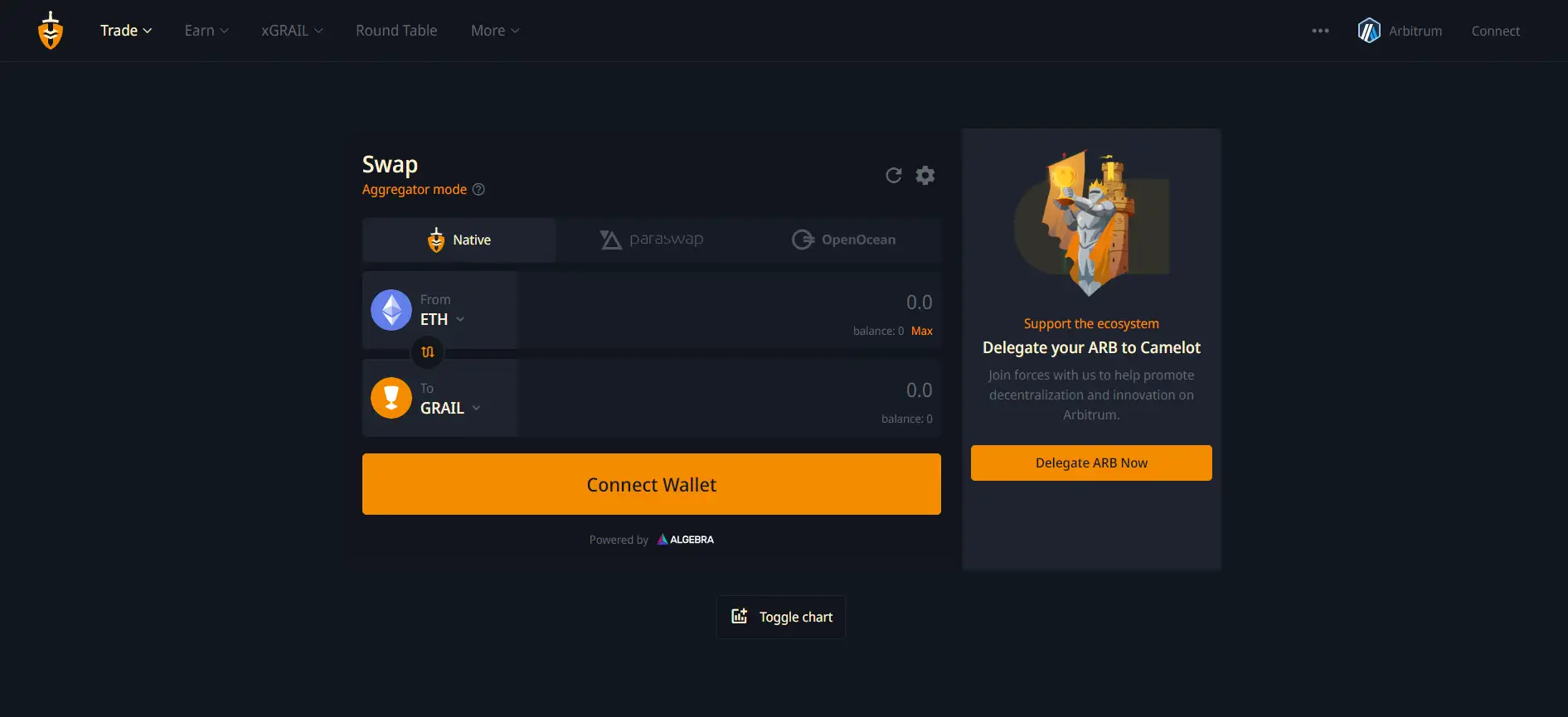 - Access Camelot Exchange: Navigate to the official Camelot Exchange platform at camelot.exchange. Click on the “Connect Wallet” button, then select your wallet to establish a connection with the exchange.