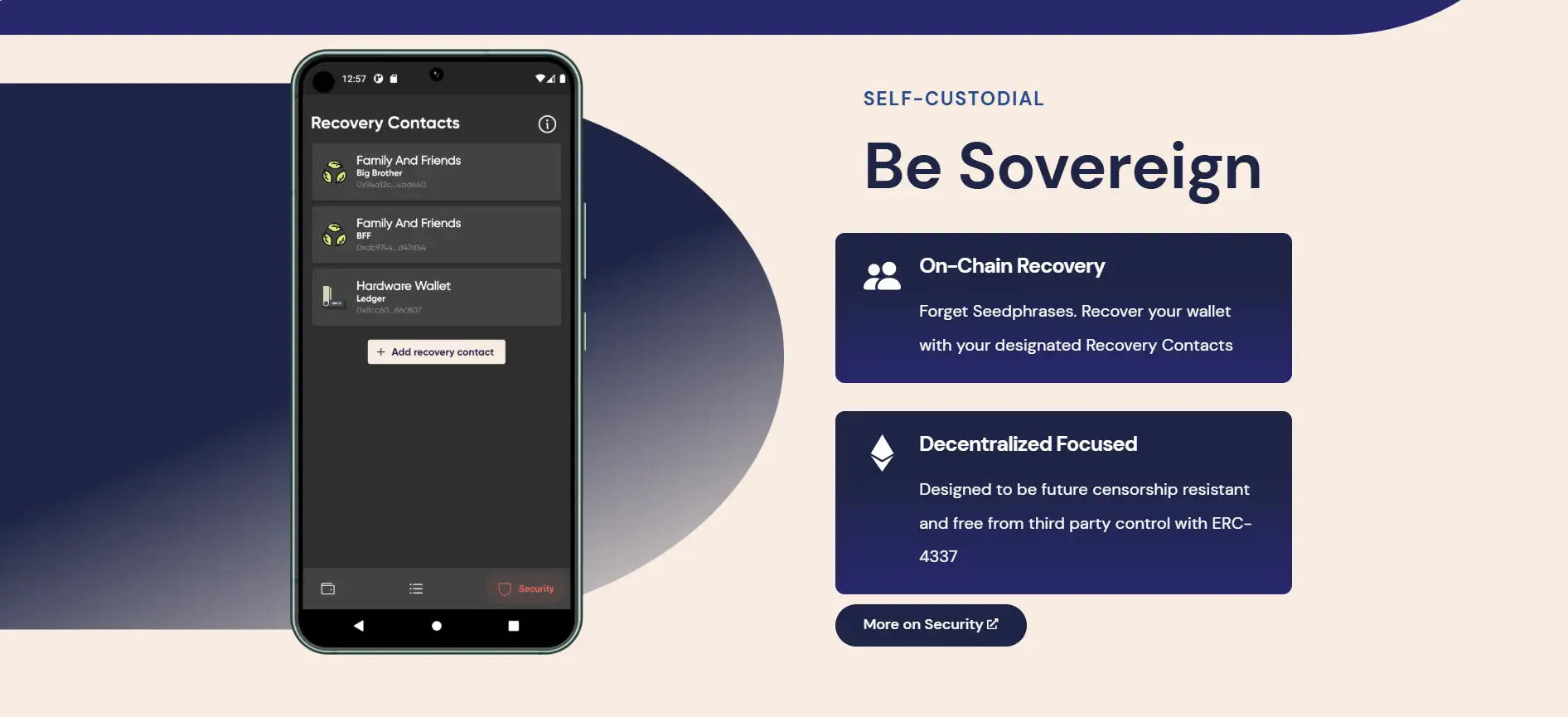 - Seedless Security: Replace traditional seed phrases with on-chain recovery using trusted contacts for better security and convenience.