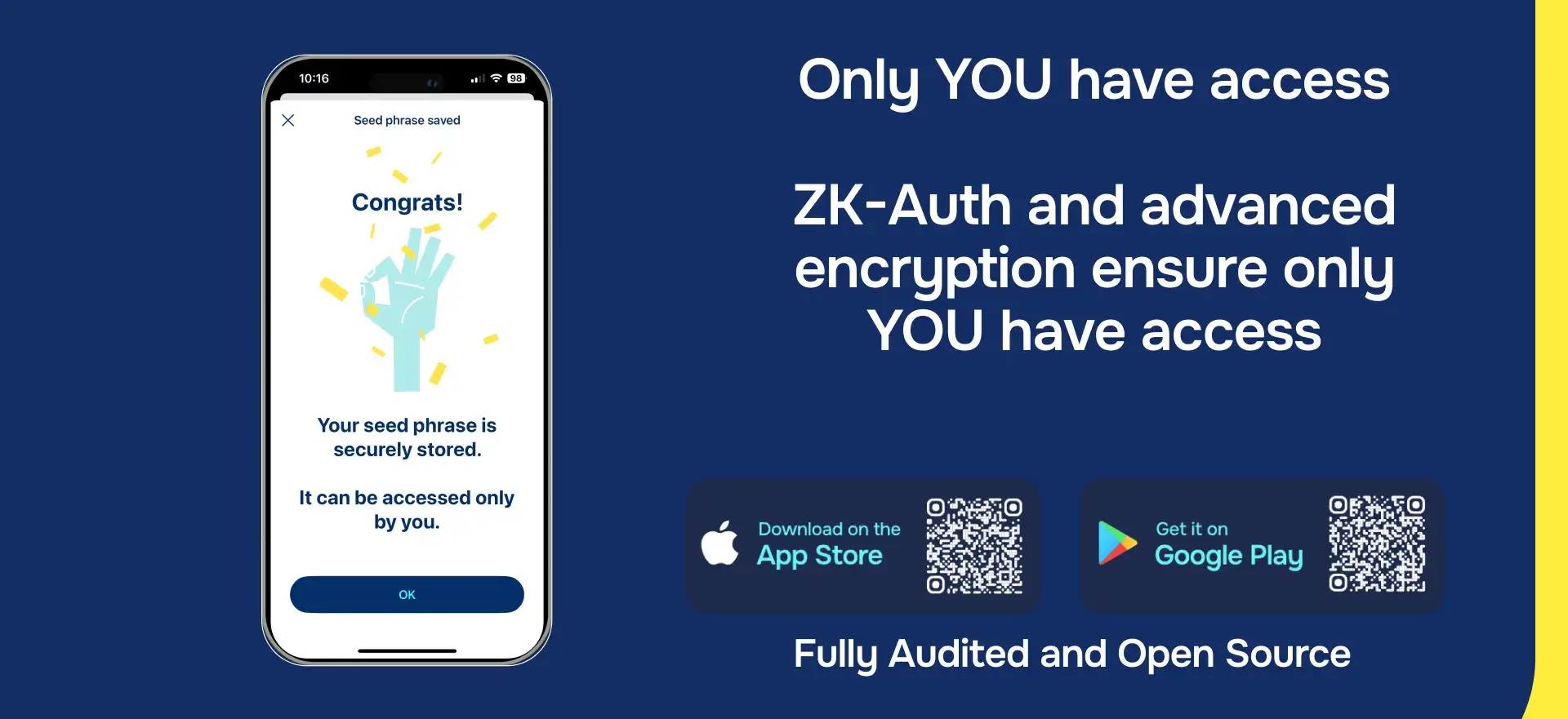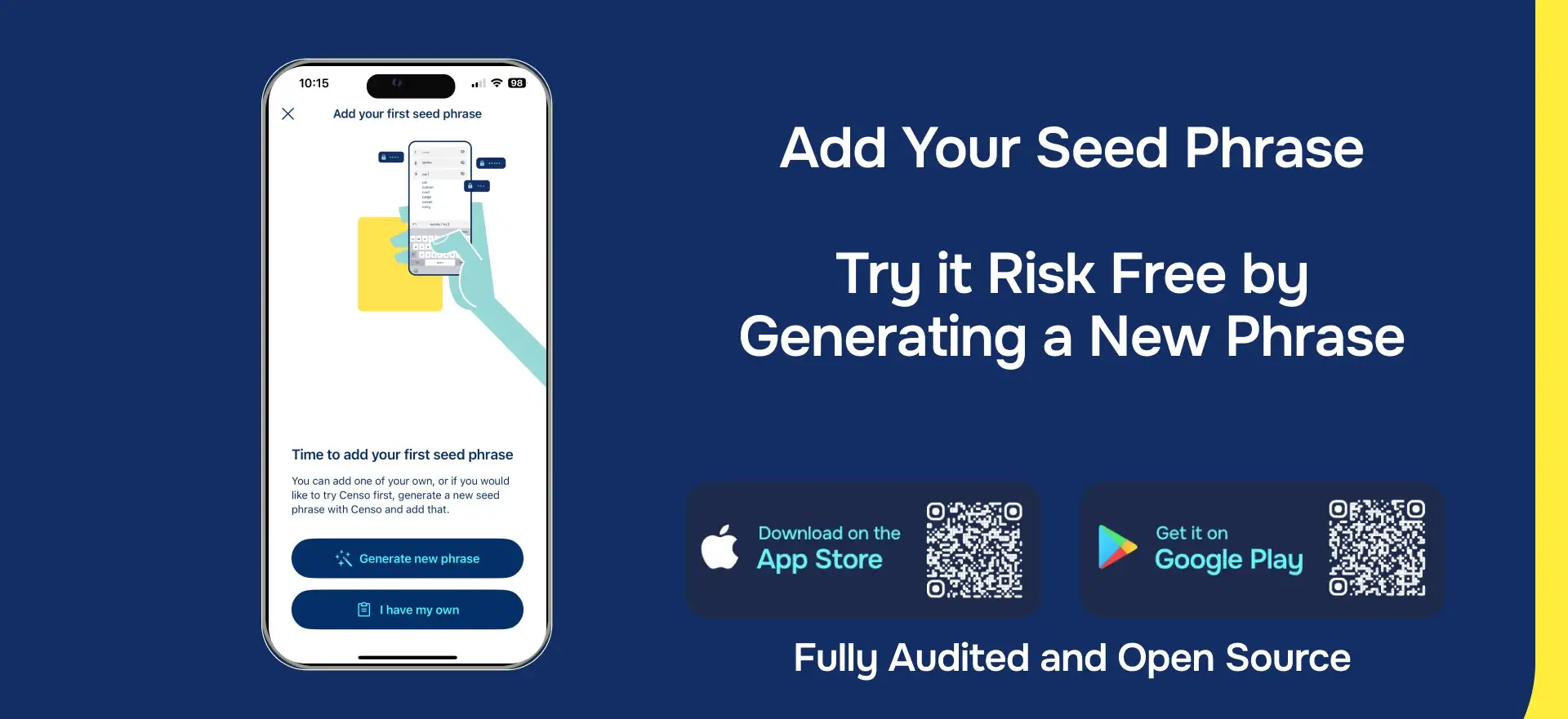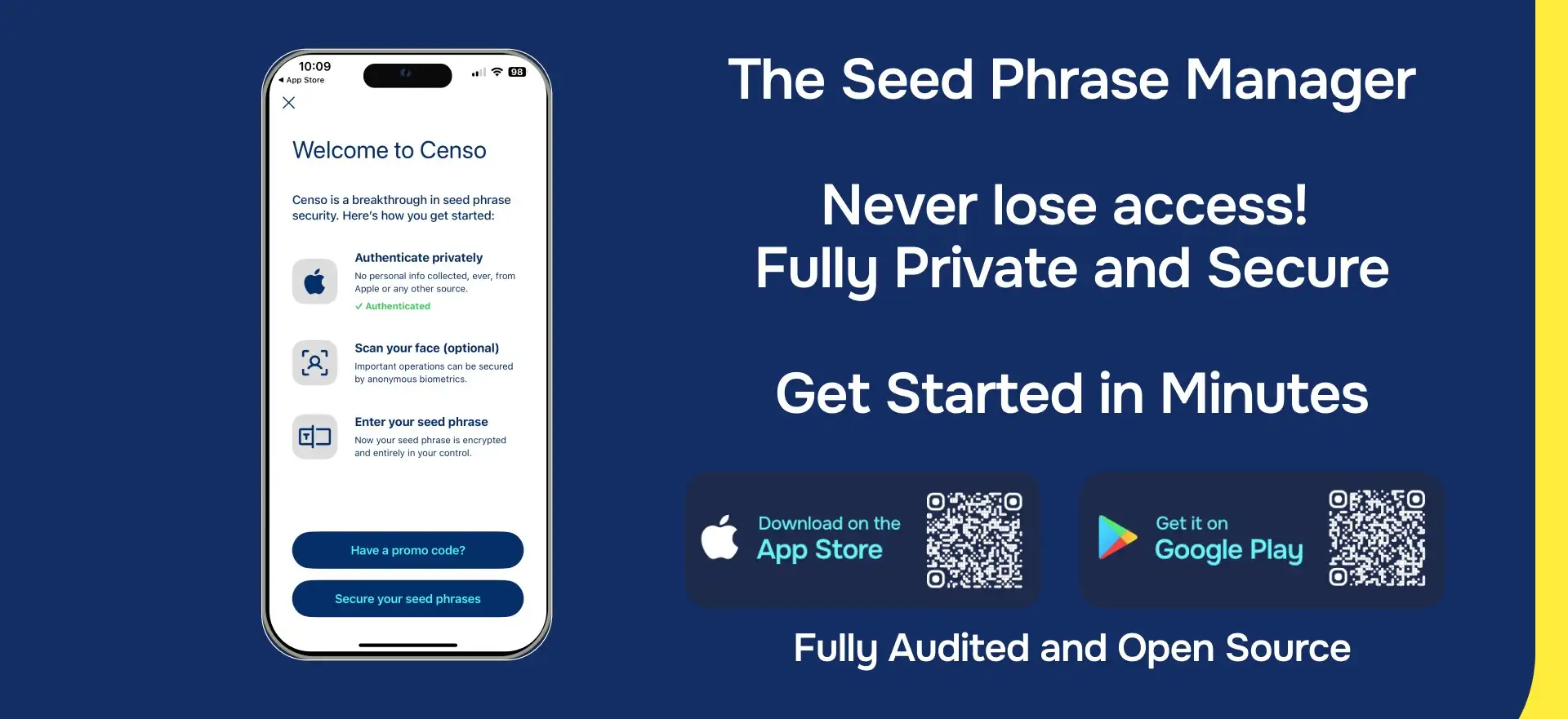 Censo uses advanced encryption technology to securely store your seed phrases. It employs zero-knowledge authentication, ensuring that no personal information is collected or stored, providing total anonymity and privacy.