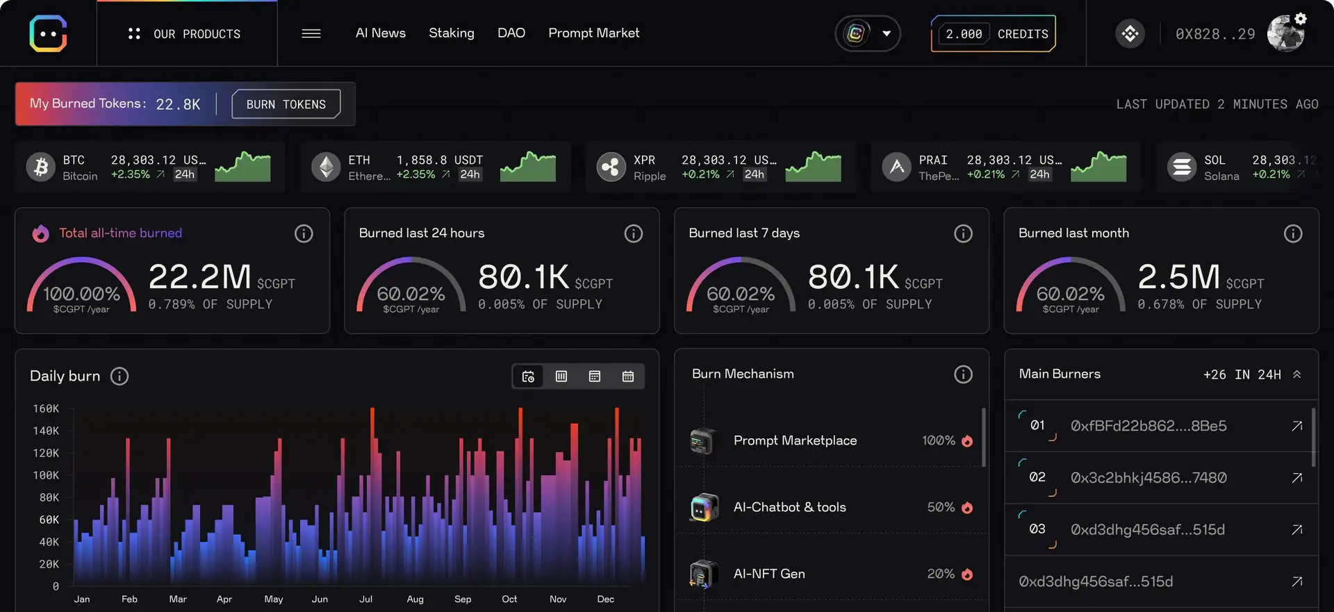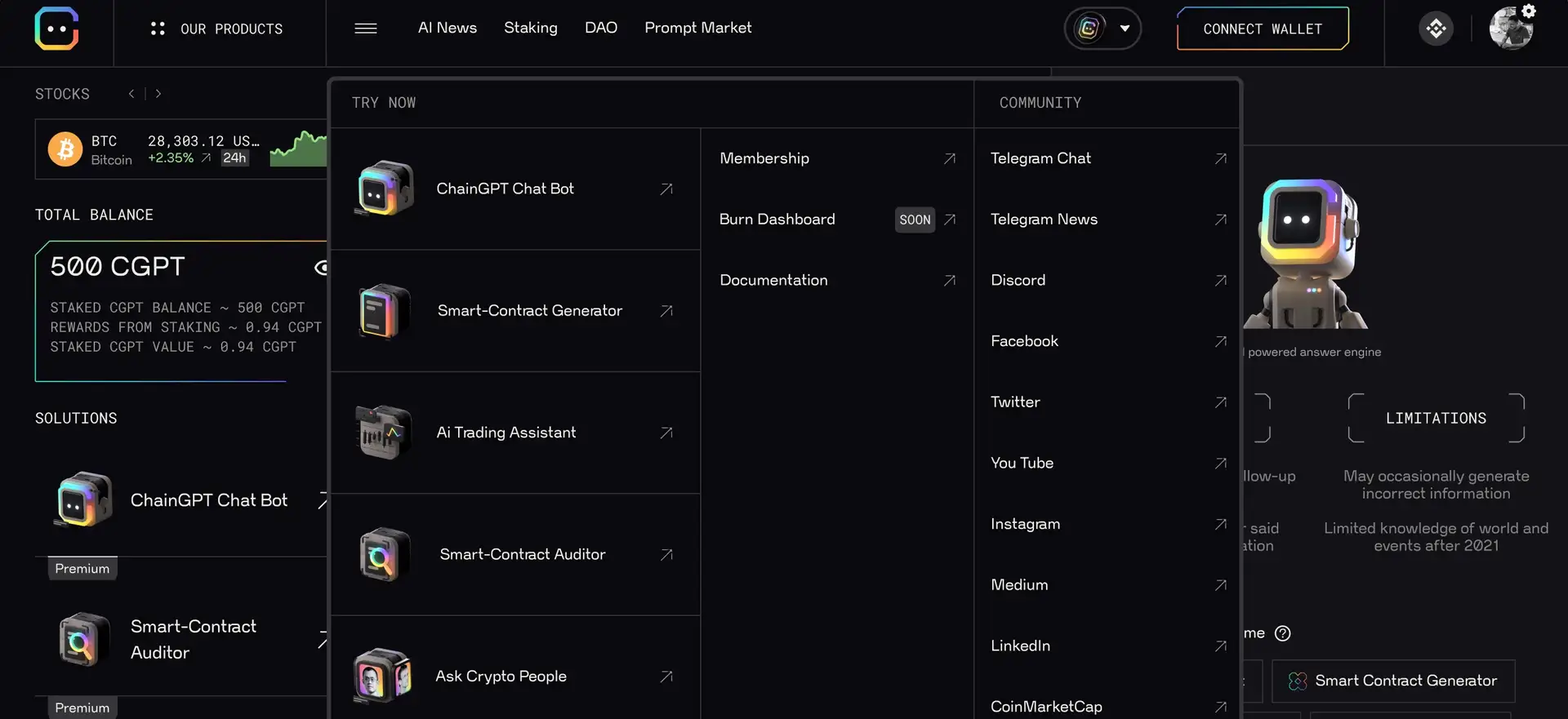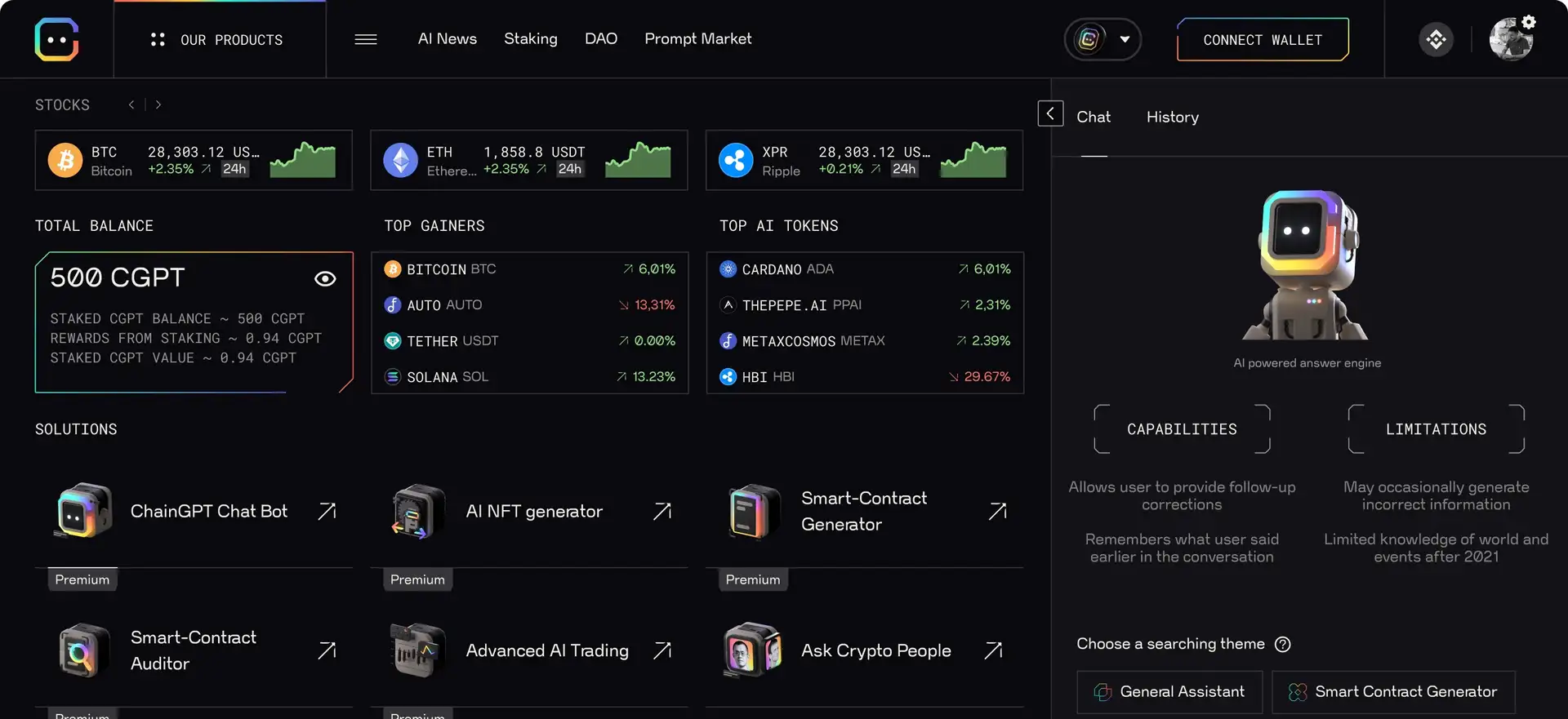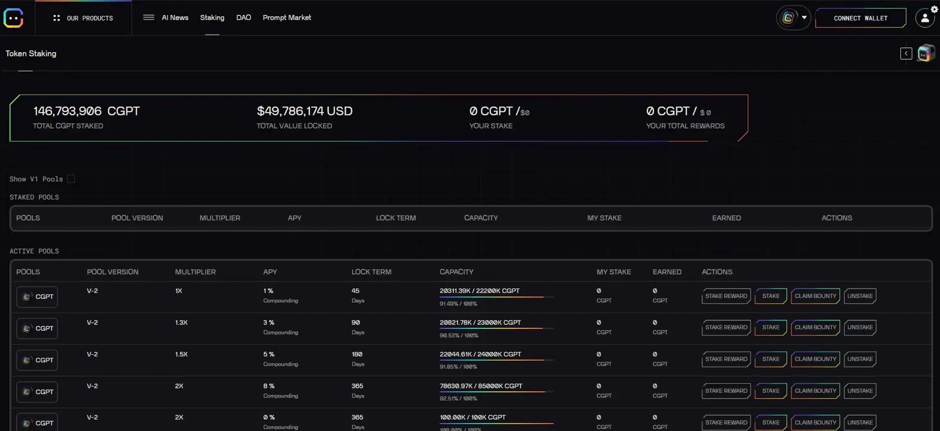 - Staking and Rewards: Users can stake their CGPT tokens to earn rewards, promoting long-term engagement and contributing to the platform’s stability and growth.