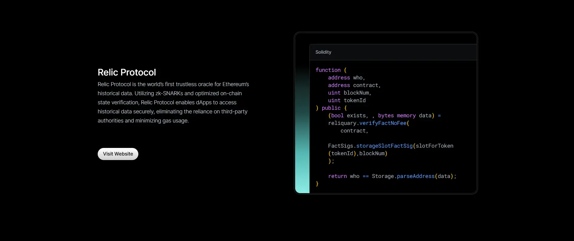 - Relic Protocol - A revolutionary trustless oracle framework that delivers zk-SNARK powered historical data to Ethereum dApps without compromising decentralization.