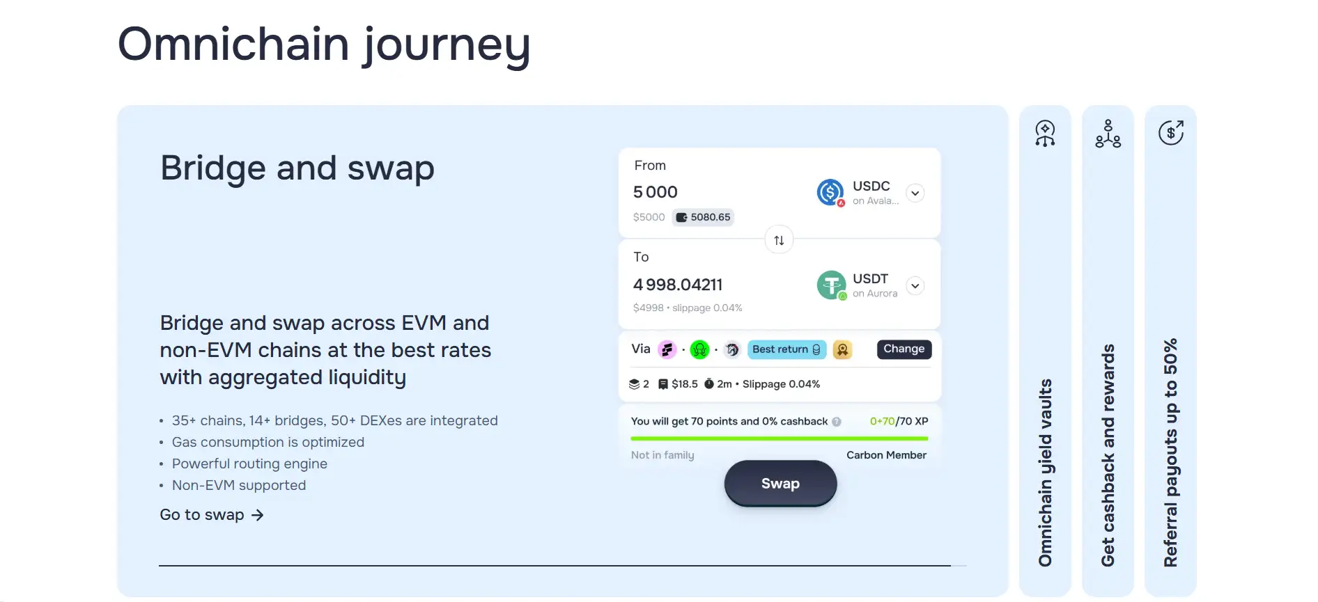 - Smart Liquidity Routing: Access optimal token exchange rates through intelligent aggregation of DEXes, bridges, and yield protocols across 40+ chains and $7B+ in total liquidity.