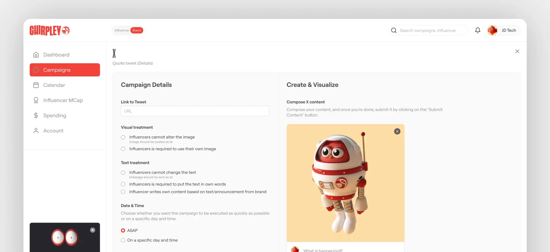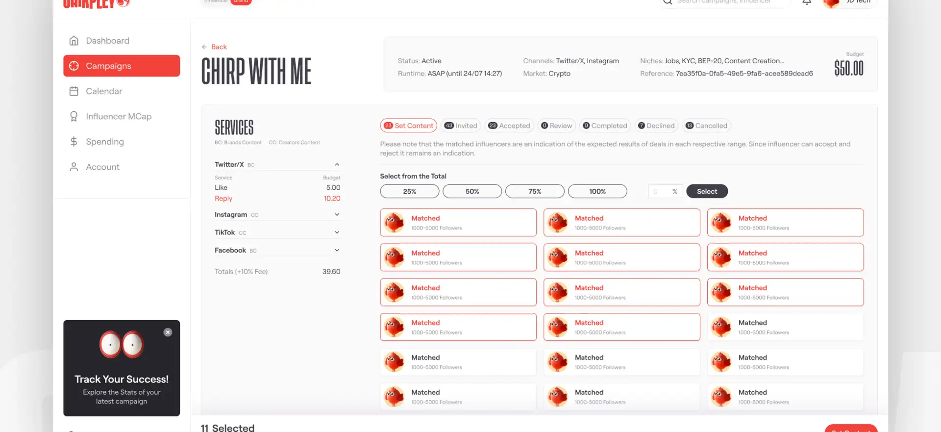 - Start a Campaign: Marketers can use the automated tools provided by Chirpley to create and launch their marketing campaigns. The platform will match you with the most suitable influencers based on your campaign criteria.