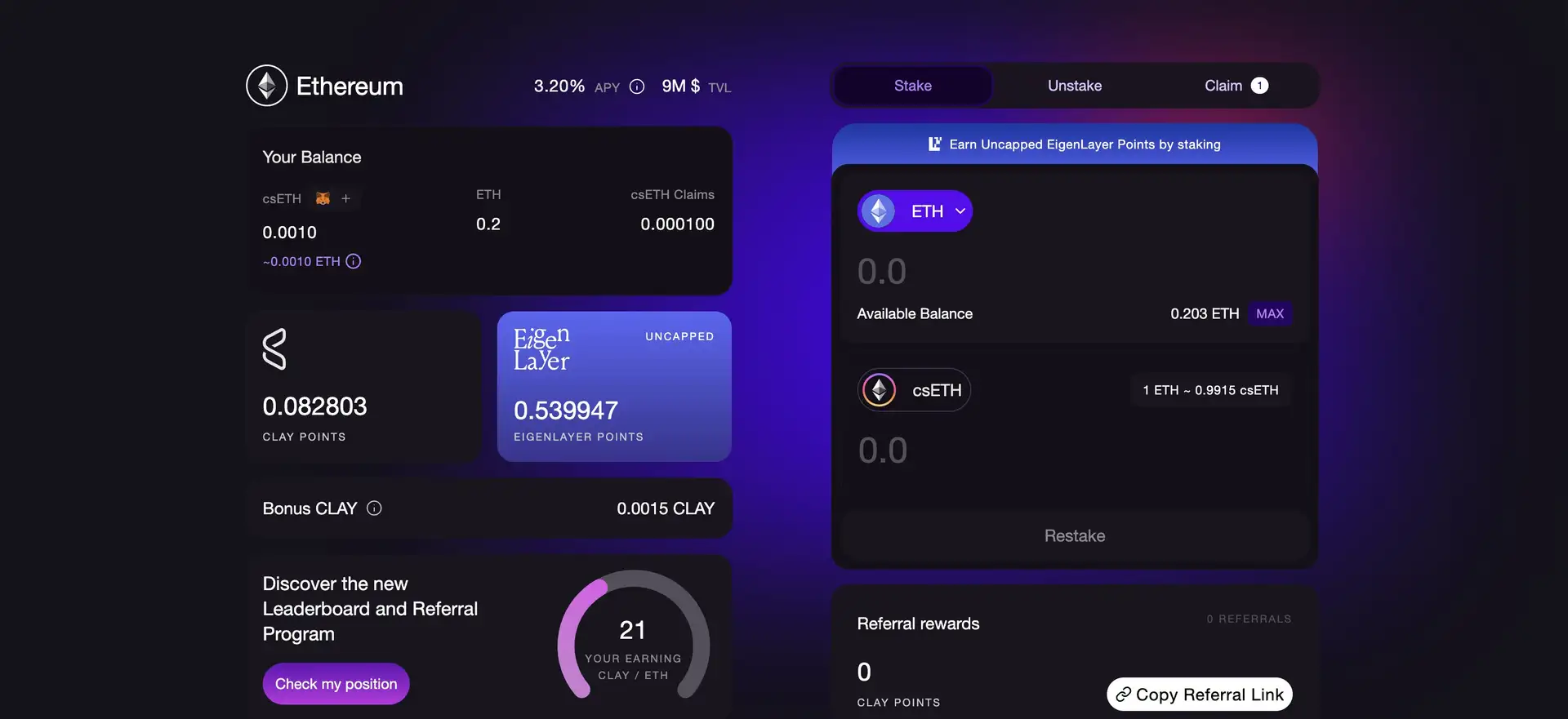 - ClayStack offers restaking functionality via EigenLayer. csETH holders can restake their assets to earn additional rewards. This feature enhances the earning potential of users by allowing them to participate in multiple staking opportunities.