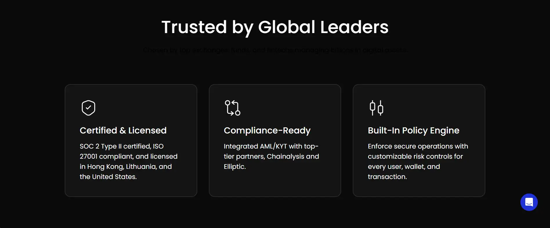 Cobo is SOC 2 Type II certified, ISO 27001 compliant, and licensed in multiple jurisdictions including the U.S., Hong Kong, and Lithuania. It integrates directly with Chainalysis and Elliptic for AML/KYT checks, ensuring that all transactions meet high regulatory standards without sacrificing operational speed.