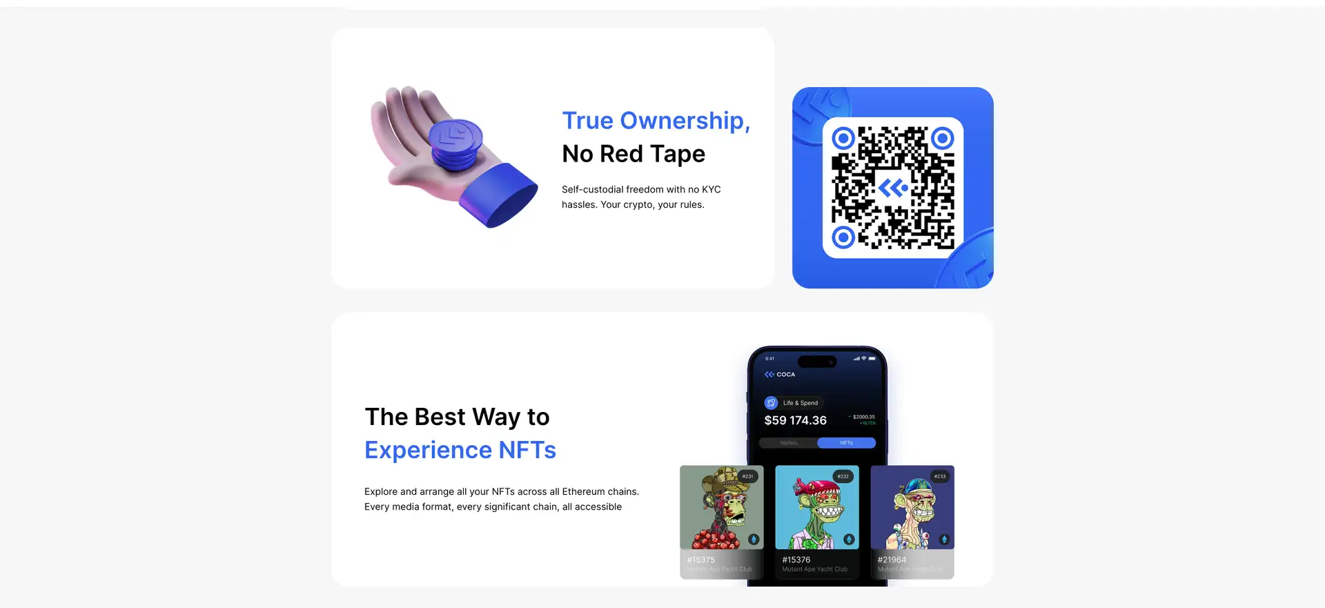 - True Ownership: COCA Wallet provides complete control over digital assets through a self-custodial approach. This means users do not need to undergo KYC (Know Your Customer) processes, maintaining privacy while managing crypto assets.