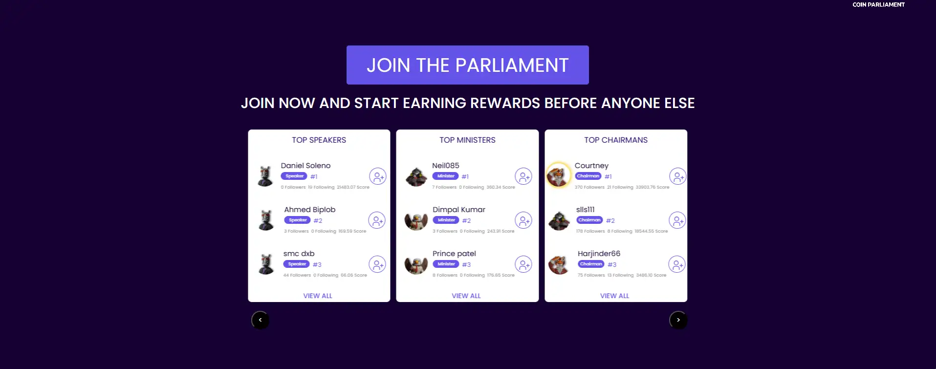 Your influencer title — such as Chairman, Minister, or Speaker — determines how many bonus rewards you earn per vote. The higher your level, the greater your share of the reward pool. Titles are earned based on voting activity and follower count, making engagement a core part of strategy on Coin Parliament.