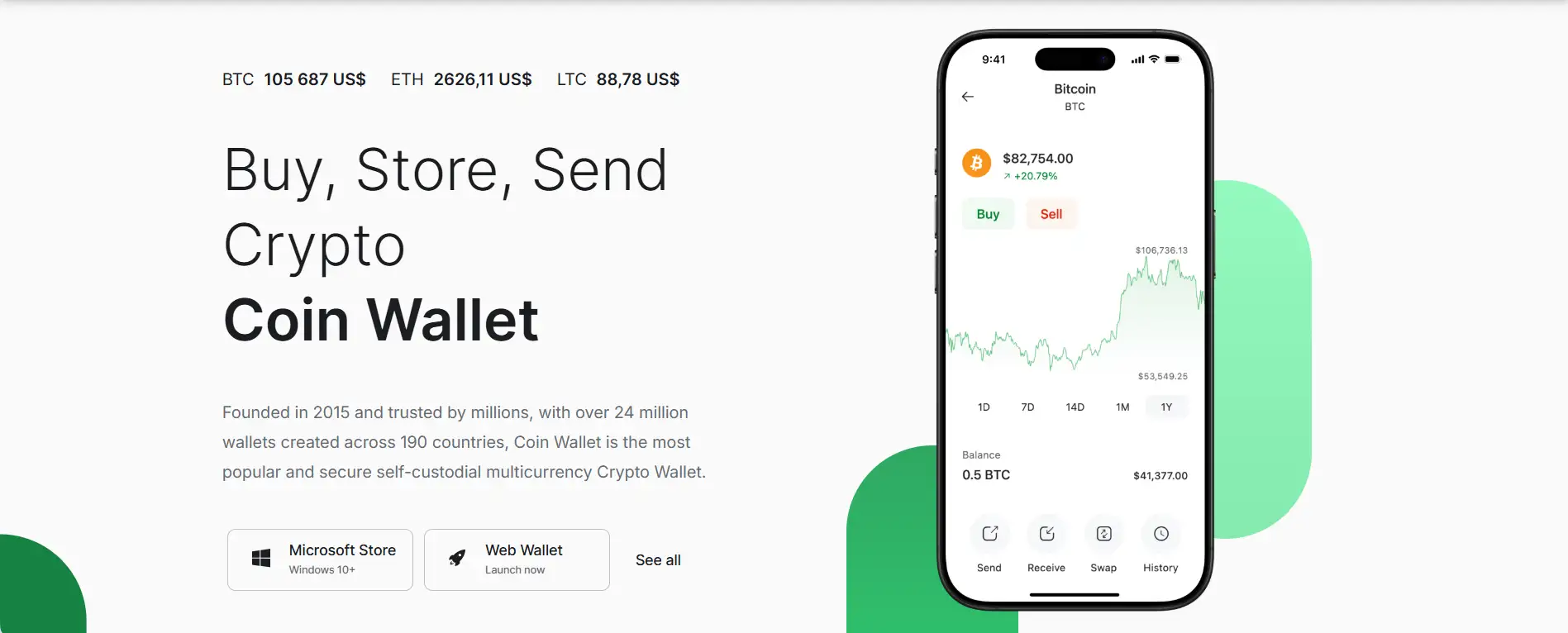 Coin Wallet stands as one of the longest-running and most widely adopted self-custodial crypto wallets in the world. Founded in 2015, the platform has grown significantly, boasting over 24 million wallets created across more than 190 countries. Its mission is to provide a simple, secure, and private interface for interacting with digital assets while upholding user sovereignty through full control over private keys. Available on web, mobile, and desktop, Coin Wallet is a truly cross-platform solution.