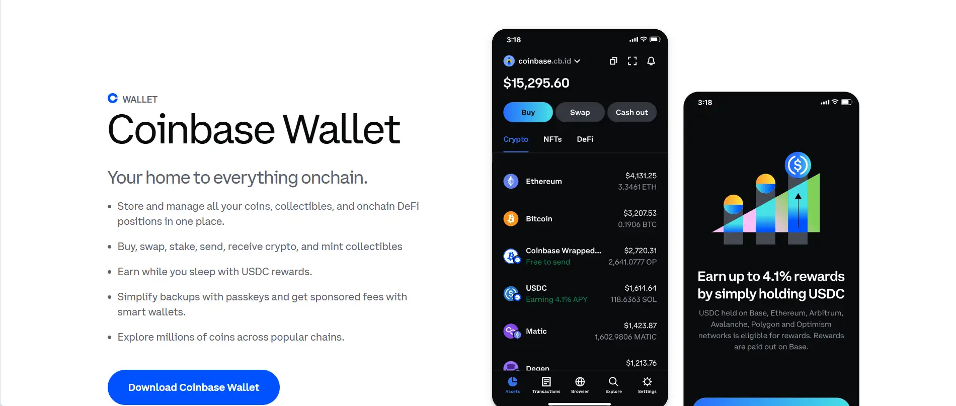 Designed to serve as a true passport to the onchain world, Coinbase Wallet offers seamless access to millions of coins and decentralized apps (dApps). Users can explore DeFi protocols, mint NFTs, play blockchain games, and launch tokens—all from a single interface. In addition to standard features like send and receive, Coinbase Wallet supports staking, swaps, smart contract interactions, and even earning USDC rewards while you sleep.