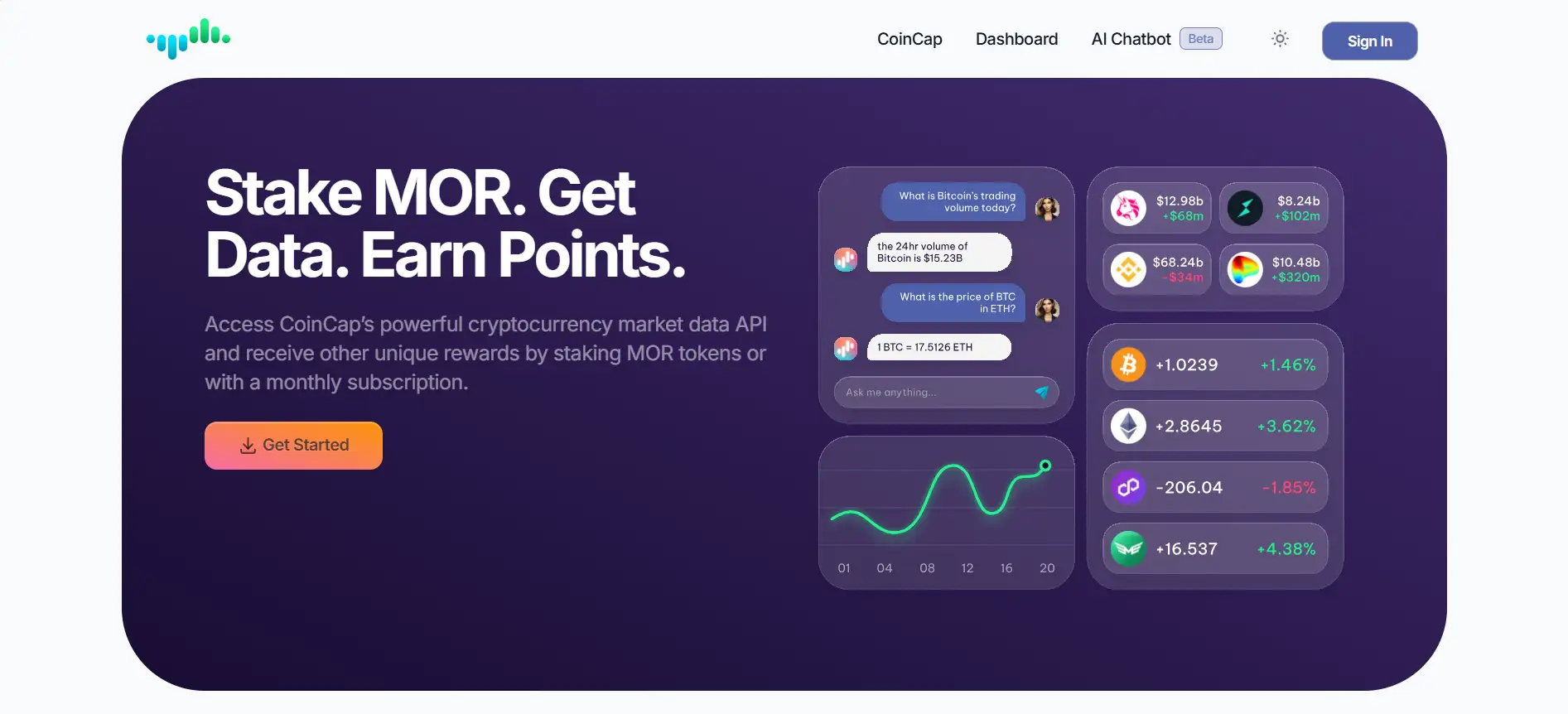 - CoinCap PRO & Staking: Stake MOR tokens or pay monthly to unlock PRO features, including access to CoinCap Points and premium API tiers.