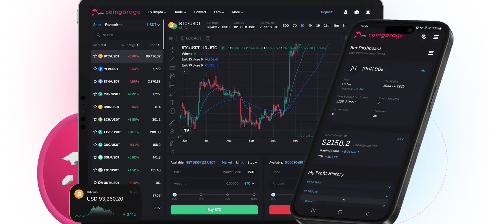 Coingarage was launched with a mission to provide a secure, fast, and feature-rich trading experience to crypto users across Europe and beyond. Built by a team of seasoned professionals and developers, the exchange supports low-fee trading, automated investment bots, and a growing ecosystem centered around its native $GARA token. As of 2025, the exchange has introduced its staking program, referral system, savings plan, and listings of over 100 digital assets.