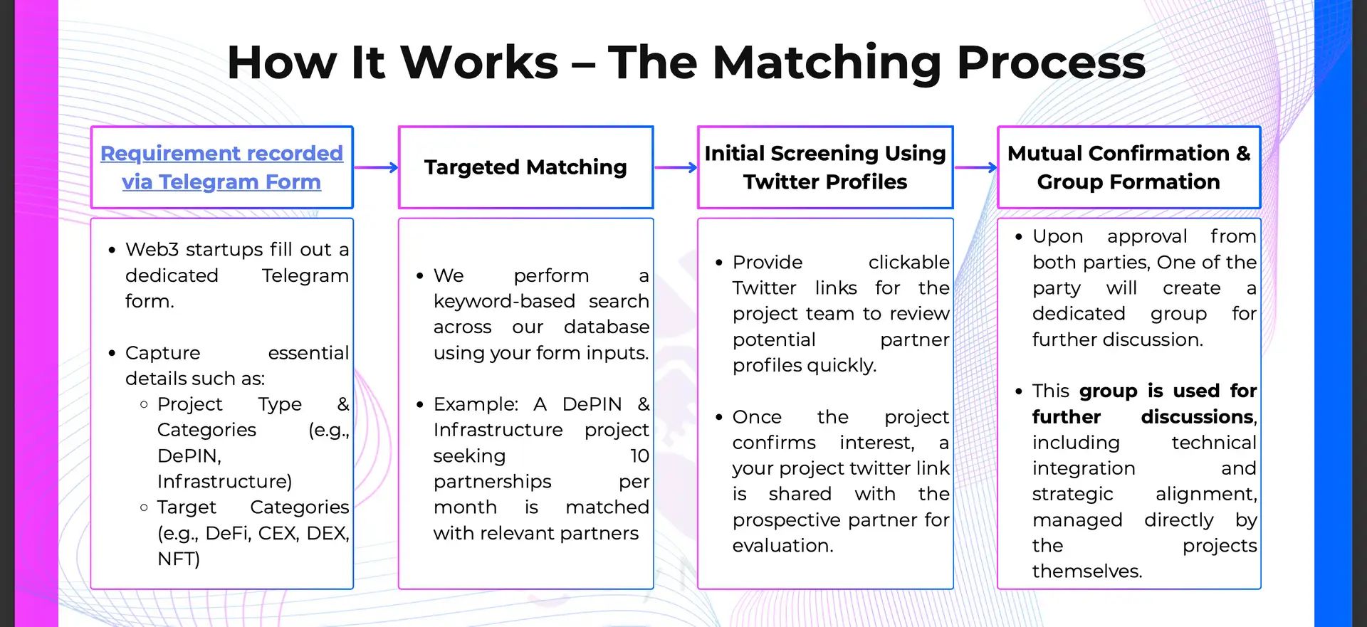 The platform is driven by verified project listings that include direct contact points, sector classification, collaboration tags, and relevant metadata. Users can either post partnership requests or explore categorized listings to initiate proposals. Every match goes through structured phases: discover, qualify, connect, and negotiate—removing guesswork and ensuring alignment. The system is designed for both startups seeking traction and established projects looking for growth catalysts.