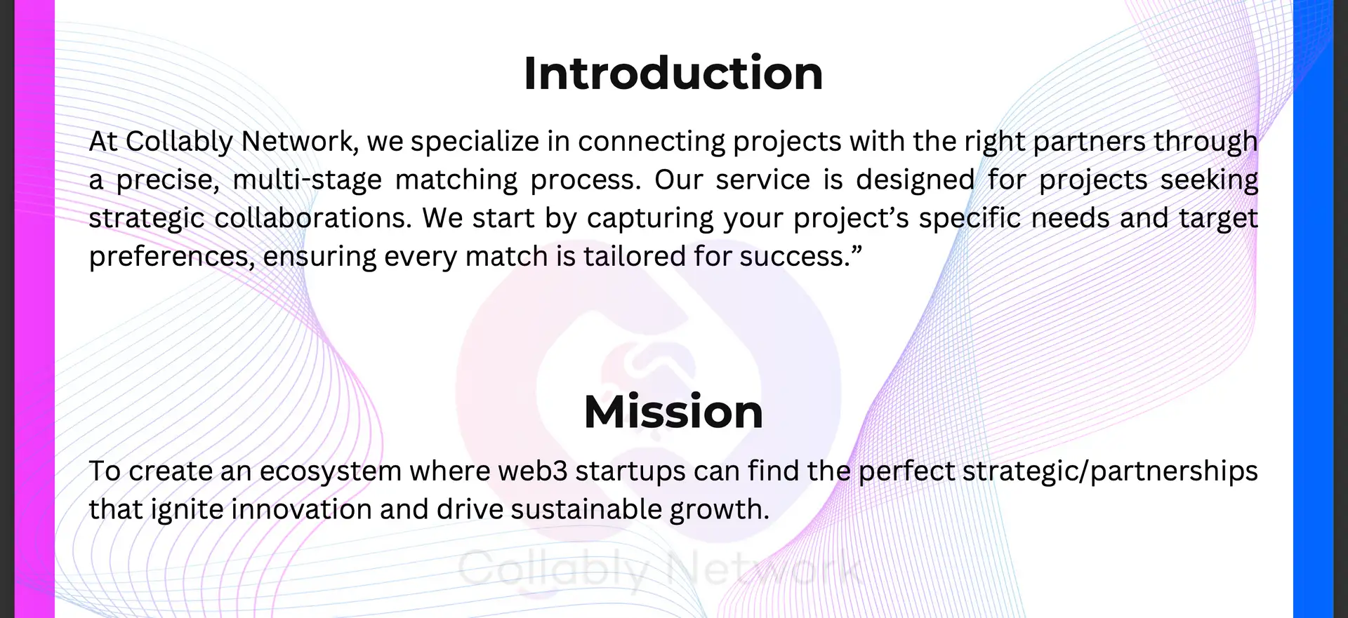 Collably Network was created to solve a critical pain point in the Web3 industry: lack of structured, scalable, and verified partnership pipelines. In a landscape where cold DMs and anonymous Telegram messages dominate, Collably Network offers a trusted matchmaking framework. It allows Web3 builders, protocols, and platforms to instantly access and initiate partnerships across a variety of verticals—including AI agents, launchpads, RWA projects, VCs, and security firms.