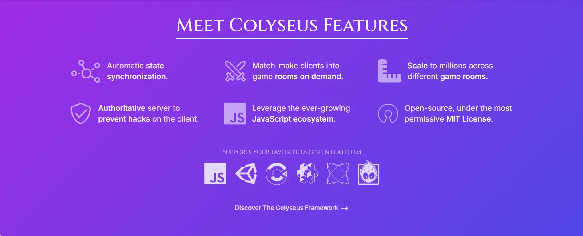 - Open Source & MIT Licensed: Use and modify Colyseus freely with zero licensing costs.