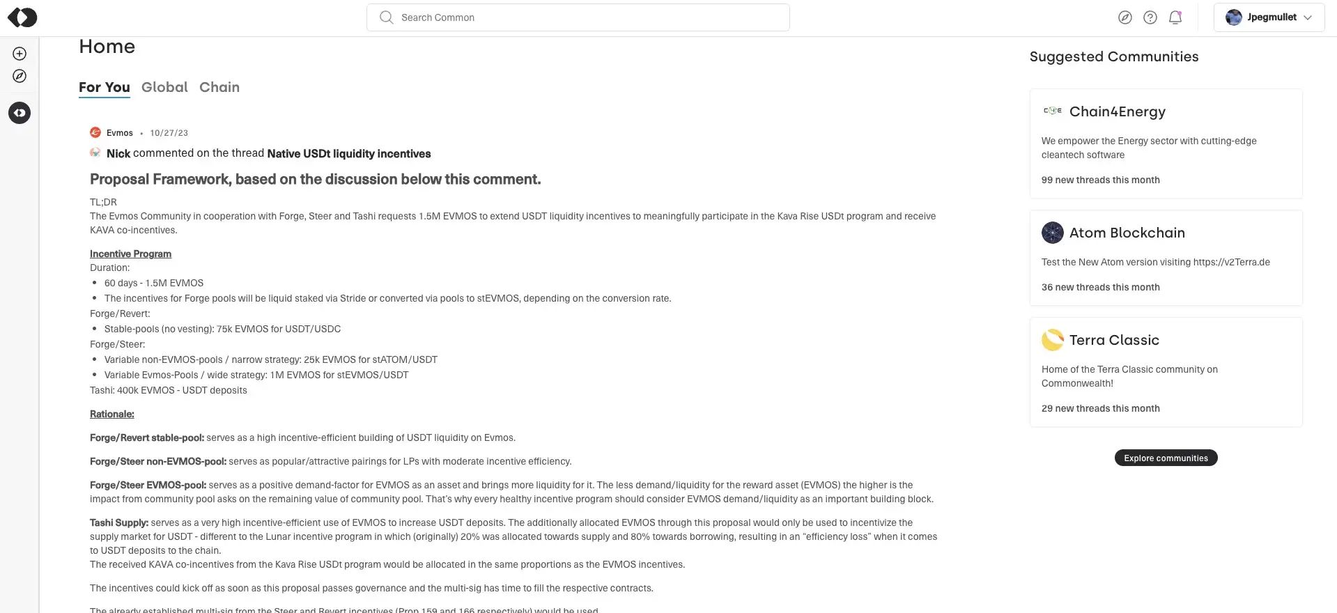 Common also integrates a forum-like discussion platform that allows community members to engage in meaningful dialogues, propose ideas, and debate the direction of their projects. This feature is reminiscent of traditional online forums but is enhanced with blockchain technology to ensure that discussions are tied directly to the governance processes of the community. The platform's discussion tools are designed to encourage active participation and foster a sense of community among members.