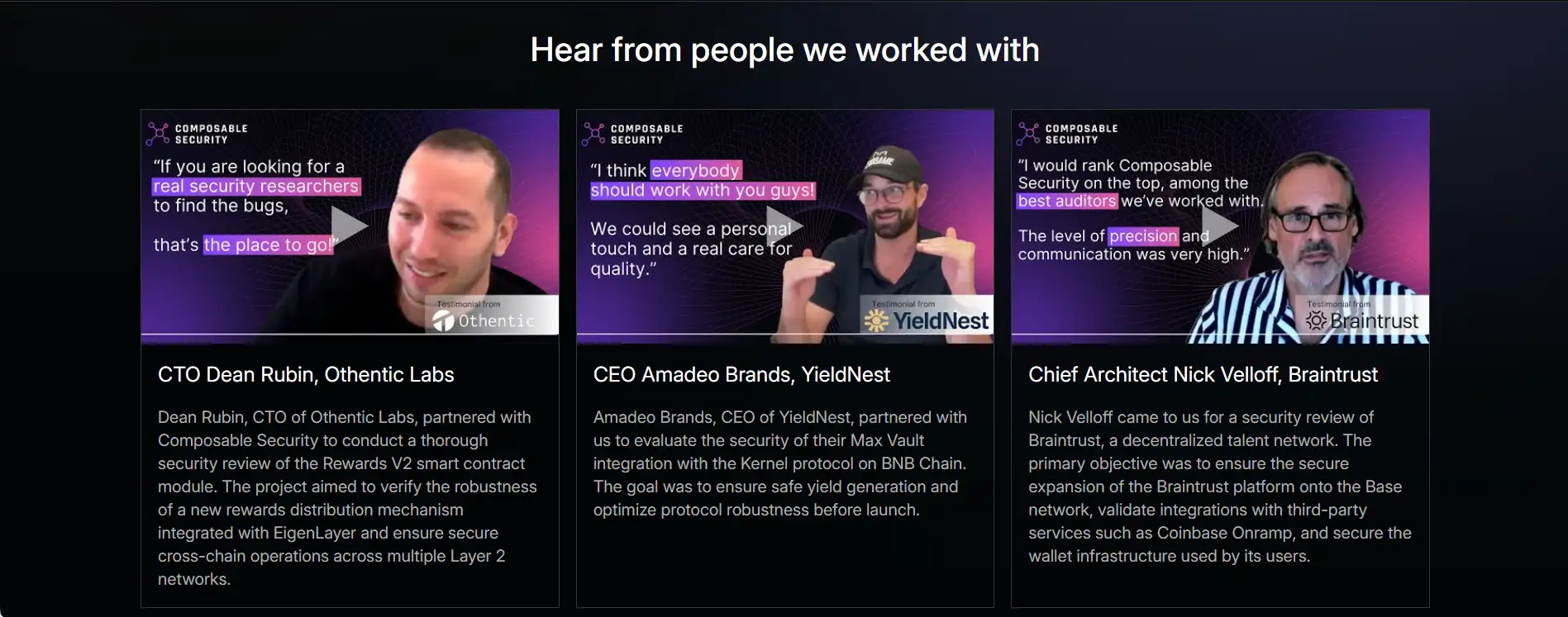 Clients consistently highlight the team’s exceptional communication and technical depth. Whether it's evaluating Max Vault integrations, AVS logic, or off-chain Oracle security for Lido DAO, Composable Security is praised for going above and beyond—often providing post-audit insight and support to harden systems further.