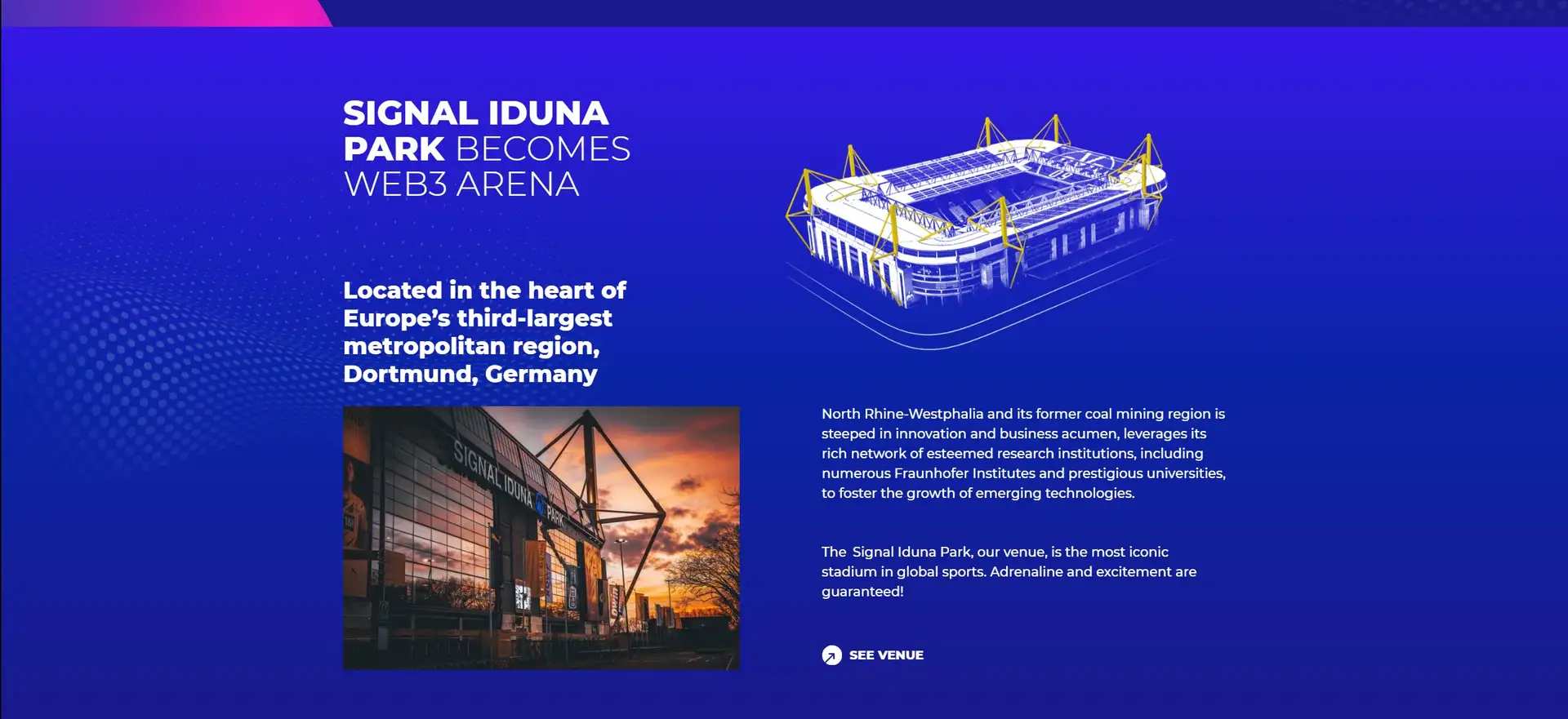 Signal Iduna Park is an innovative venue for hosting CONF3RENCE due to its dynamic and expansive space, capable of accommodating large-scale events. The stadium's modern facilities provide an exciting atmosphere, enhancing the overall experience. Its location in Dortmund, within the tech-savvy region of North Rhine-Westphalia, makes it an ideal spot for a cutting-edge Web3 and AI conference.