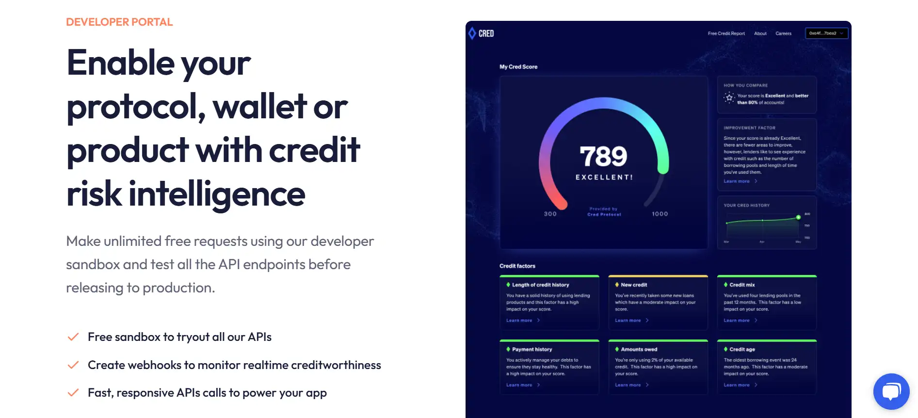 With support for 8 major blockchains and integrations with key lending protocols like Aave, Compound, and Morpho, Cred Protocol acts as a one-stop gateway for accurate, cross-chain credit assessment. APIs are available to developers through a free sandbox, making it easy to build, test, and launch DeFi tools enhanced by credit intelligence. The platform supports event-driven webhooks for real-time monitoring of delinquencies, defaults, and liquidations.