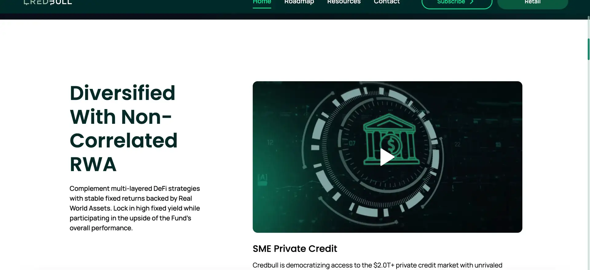 Credbull is a cutting-edge DeFi platform that aims to revolutionize the private credit market by bringing it on-chain, leveraging blockchain technology to provide a transparent, secure, and efficient alternative to traditional credit systems. The platform's primary focus is on offering high fixed yields, particularly targeting up to 10% annual returns for lenders who loan USDC through its platform. This yield is backed by real-world assets, predominantly within the small and medium-sized enterprise (SME) sector, which is typically non-correlated with the broader crypto market, providing a stable and diversified investment opportunity.
