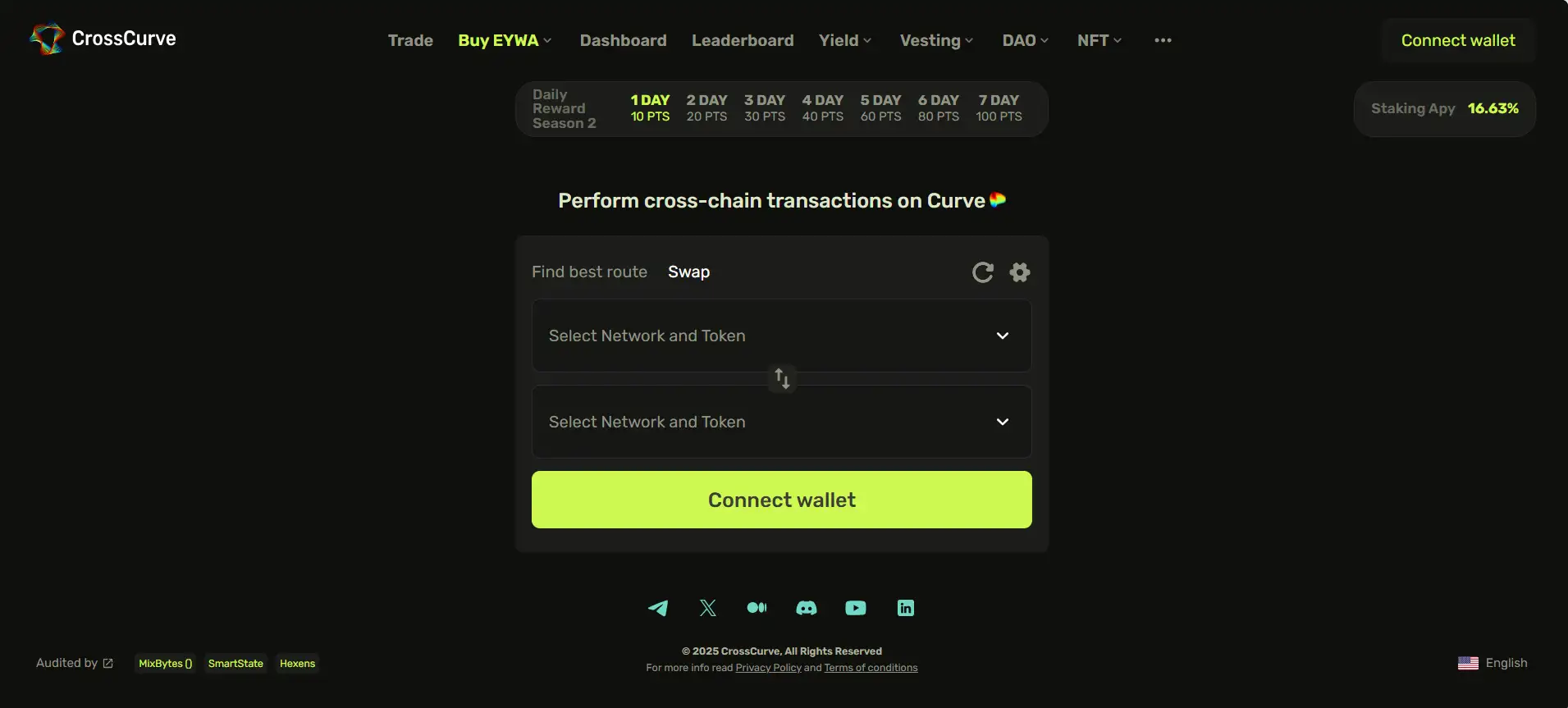 To protect cross-chain operations, CrossCurve uses the Eywa Consensus Bridge, which aggregates trusted bridge protocols like LayerZero, Axelar, Chainlink CCIP, and more. This multi-layered security approach prevents single-point bridge failures and offers chain-agnostic protection for both liquidity and governance data. Swaps, bridging, and voting data are verified through consensus, enhancing safety beyond traditional bridges.