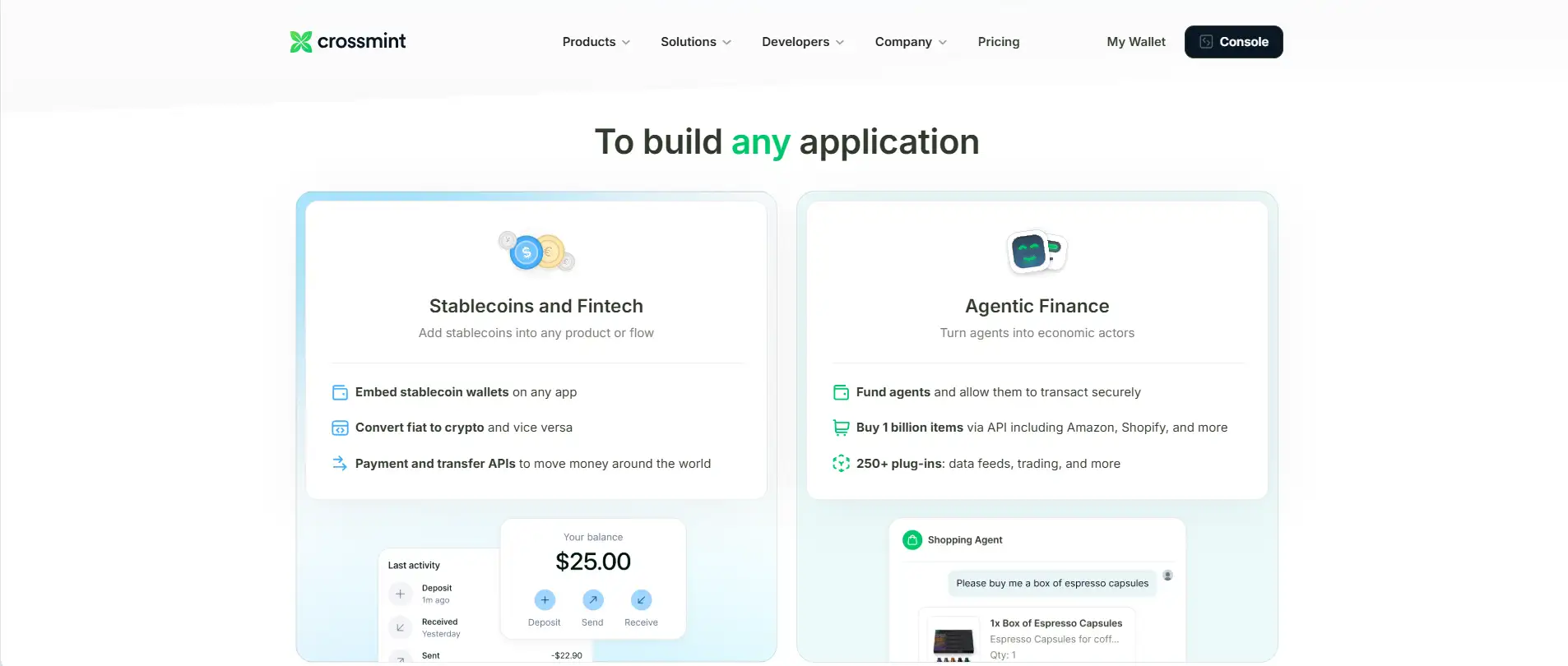 - Flexible Wallet Infrastructure: Offers programmable wallets with flexible custody (custodial, non-custodial, hybrid), allowing use in consumer apps, backend automation, and AI agents.