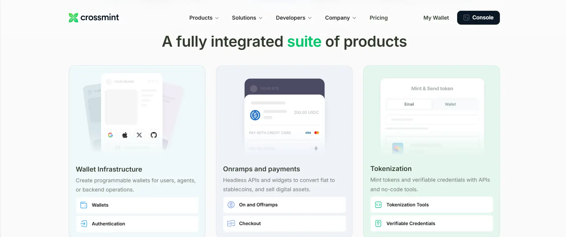 Crossmint is positioned as a foundational infrastructure provider for companies looking to integrate blockchain-based features into their products—without needing deep Web3 expertise. Their mission is to enable anyone to build blockchain-powered applications at scale, while abstracting away the technical complexities of Web3 such as gas fees, wallet onboarding, or transaction approvals. At its core, Crossmint offers a unified suite of tools covering programmable wallets, tokenization, verifiable credentials, on/off ramps, and enterprise-grade authentication.