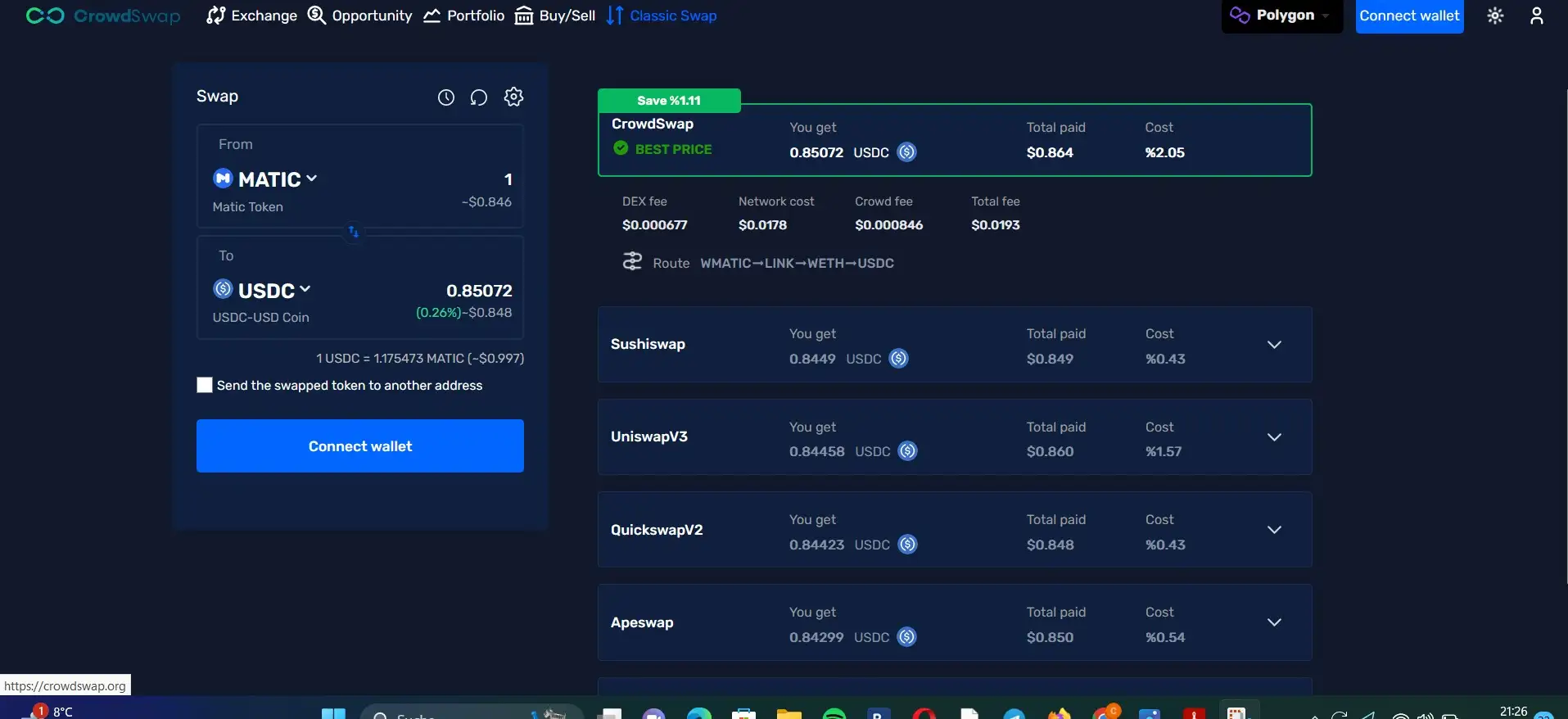 CrowdSwap uses advanced price routing and aggregation technology to compare rates across multiple decentralized exchanges (DEXes). This ensures users always receive the most favorable rates for their token swaps, reducing costs and enhancing the trading experience.