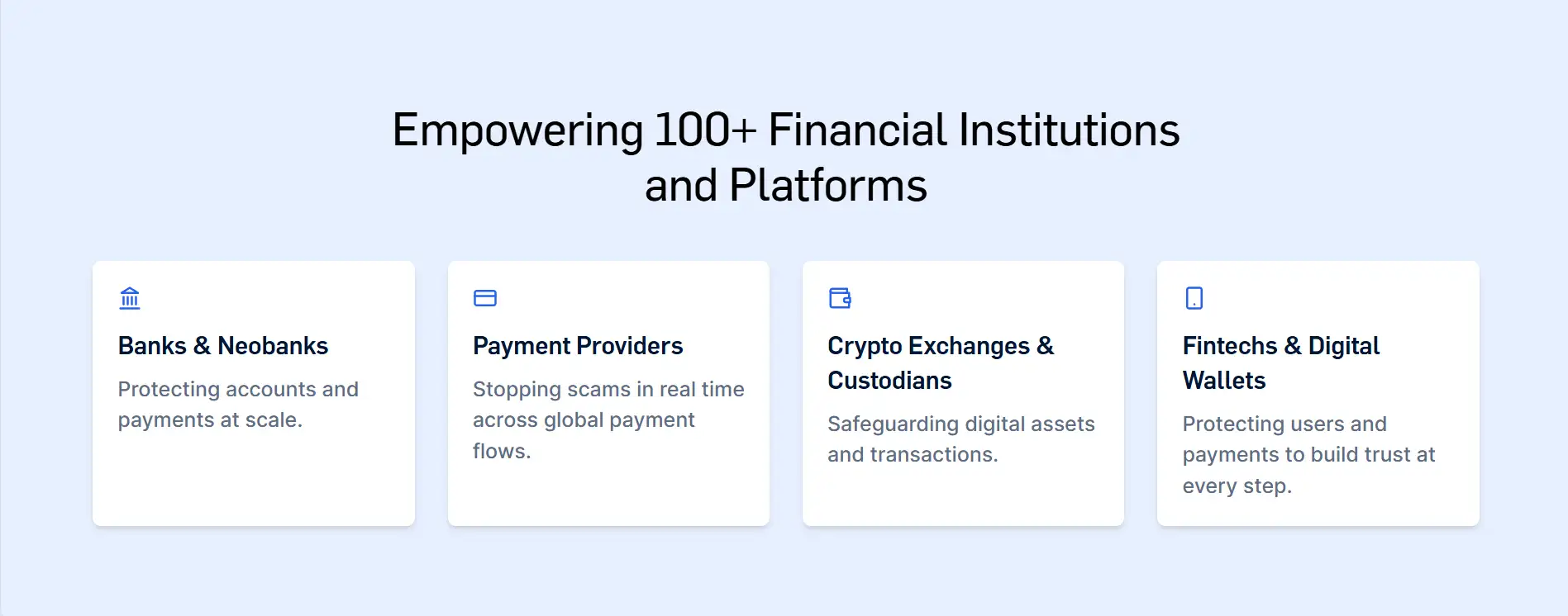 - Full Ecosystem Coverage: Monitors wallets, smart contracts, payment identifiers, and onboarding flows for connected threat signals.