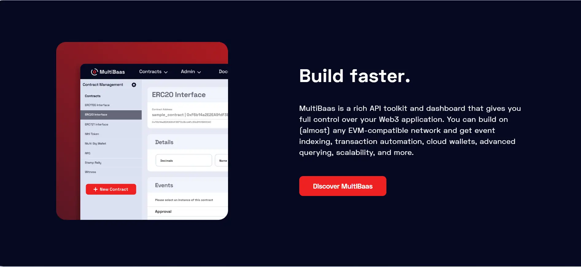 - Explore MultiBaas: Log into the MultiBaas dashboard and begin connecting to your preferred EVM chain. Use the REST API, SDKs, or visual interface to manage smart contracts.