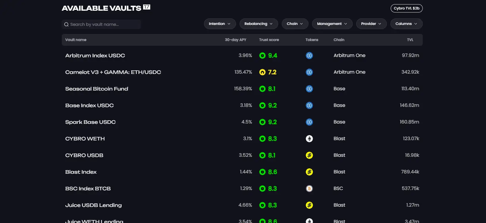 CYBRO is redefining decentralized yield optimization by wrapping advanced DeFi strategies into clean, easy-to-use interfaces backed by artificial intelligence. With features like One-Click Vaults, Beta AI Broker, and Seamless Token Deposits, the platform democratizes high-yield investing across leading blockchains like Arbitrum, Base, Blast, and BSC. Each vault on CYBRO includes detailed APY breakdowns, trust scores, and TVL data, so users can choose strategies that align with their risk profile and goals.