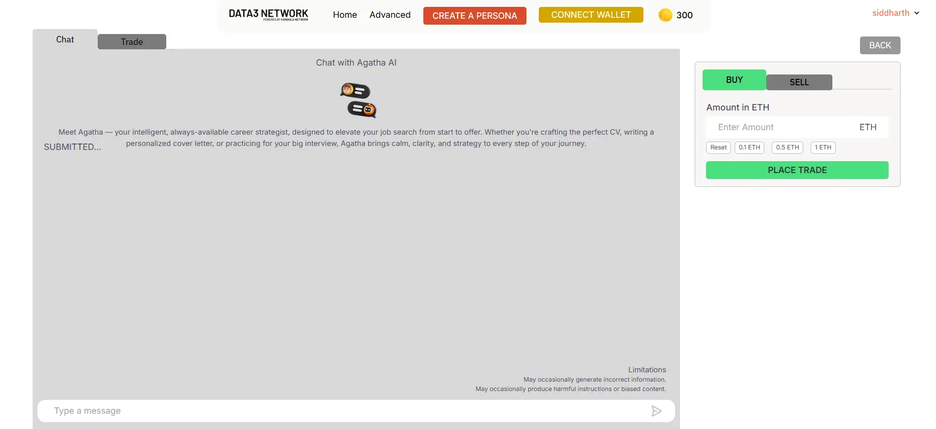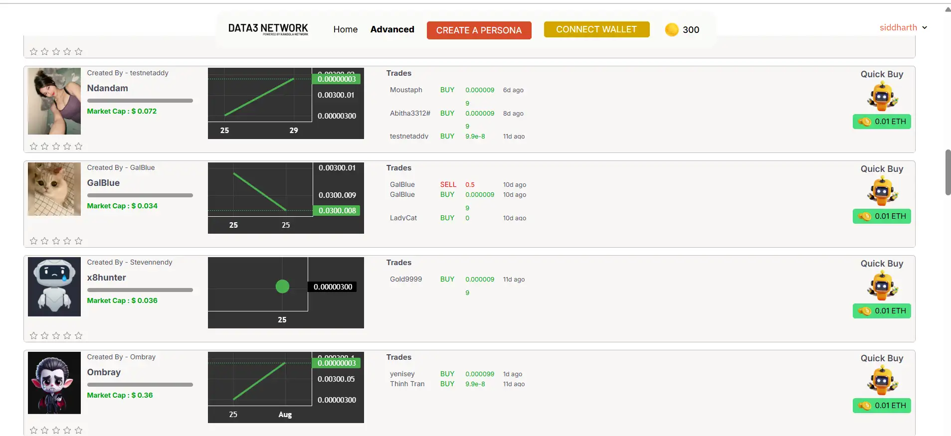 Through its intuitive user interface, Data3 Network provides a powerful way for users to launch AI personas without coding, manage ownership via smart contracts, and participate in a dynamic creator economy. It is particularly notable for its integration of a bonding curve mechanism that determines the pricing of AI Coins in a trustless and automated manner.