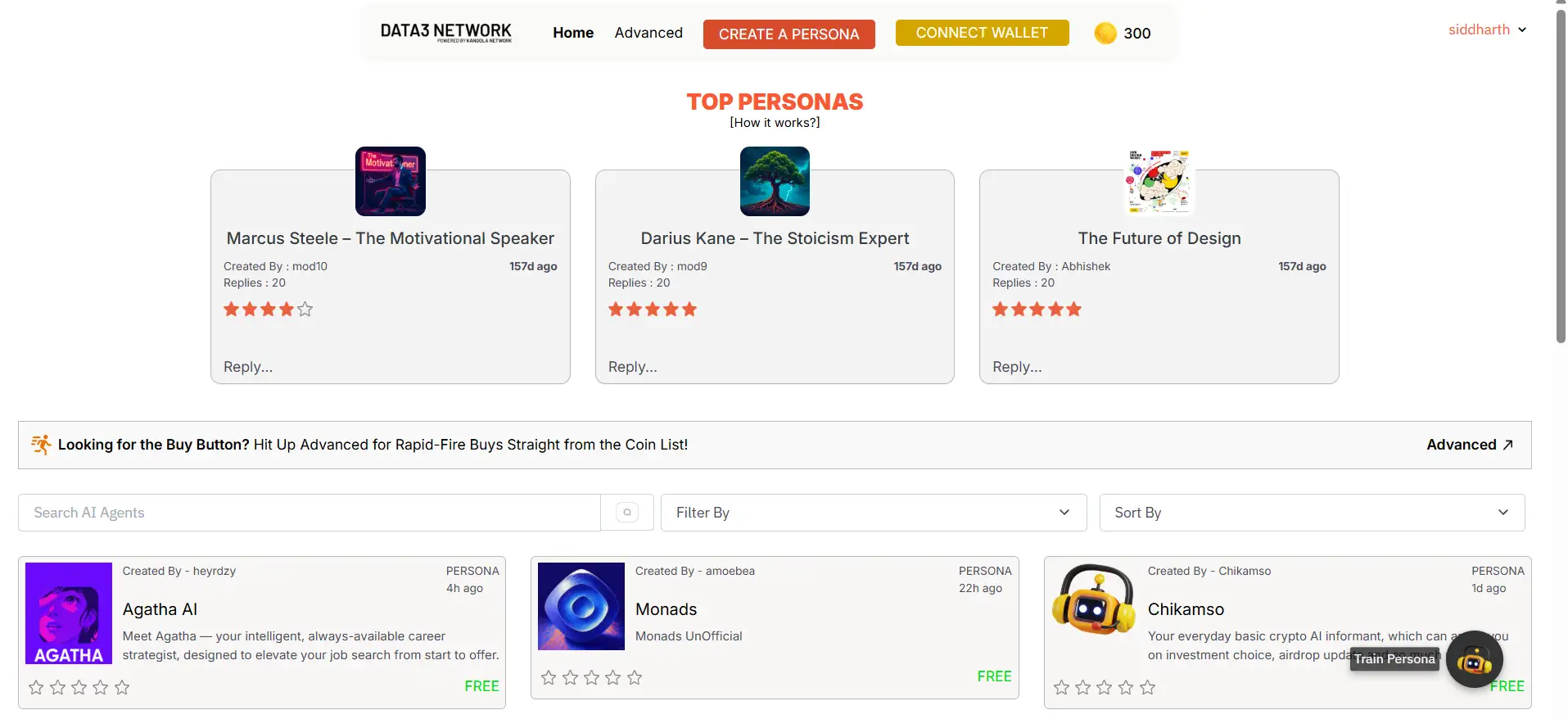 - Explore Personas: On the homepage, you'll find top-performing AI agents under “Top Personas.” Click on any to view its profile, use it, or purchase its coin.