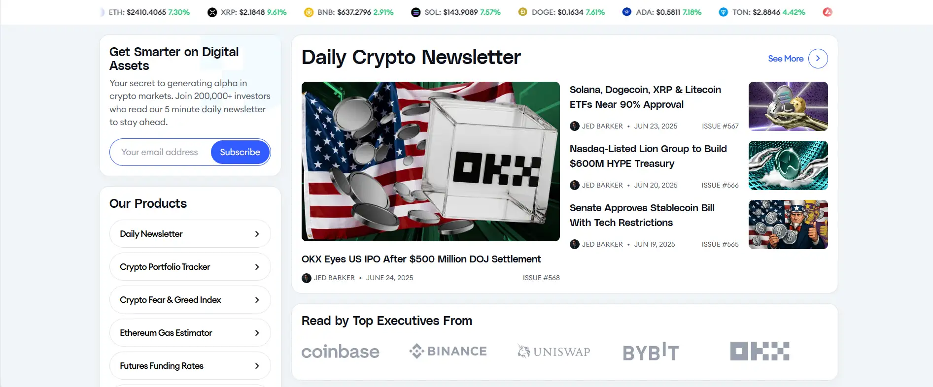 - Expert-Led Daily Newsletter: Stay informed with a concise, high-quality newsletter read by over 200,000 crypto investors, summarizing key trends, market shifts, and breaking developments.