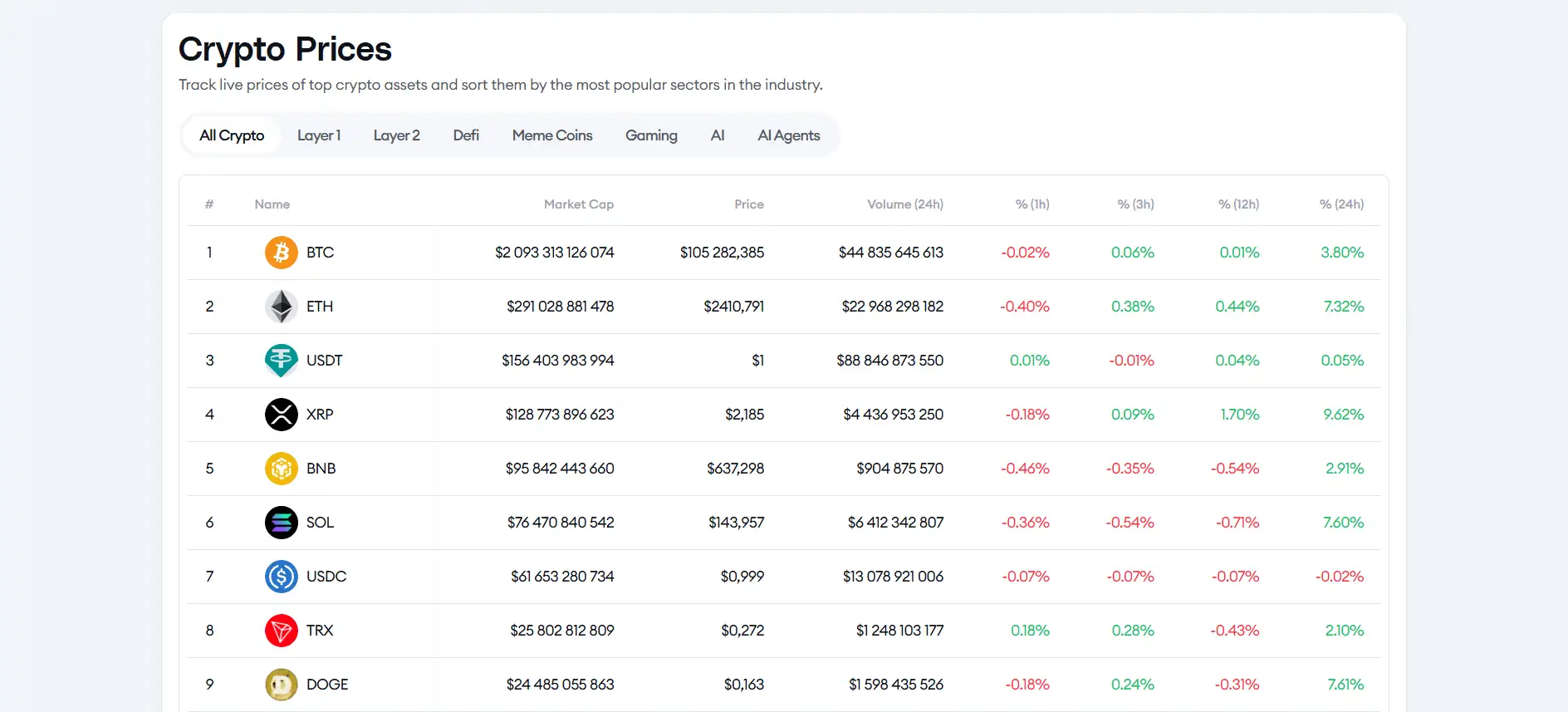 - Live Crypto Price Feed: Follow live price movements and performance of major cryptocurrencies, sorted by category like Layer 2s, Meme Coins, or Gaming Tokens.