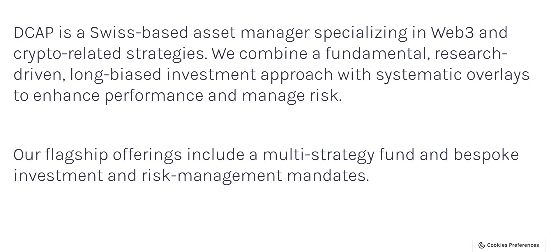 DCAP is a Swiss-based, FINMA-licensed asset manager focused on delivering high-quality exposure to Web3 and digital asset markets. With a commitment to transparency, performance, and institutional-grade operations, DCAP combines traditional financial discipline with forward-looking innovation to offer holistic investment solutions for the evolving blockchain economy.