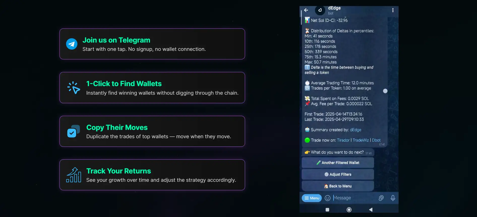 Yes. dEdge is built to eliminate guesswork. The platform delivers profitable wallet insights in plain terms and offers direct one-click copying through Telegram. Beginners can start with Wallet Finder, join the public Telegram group to ask questions, and even schedule a 1-to-1 coaching call with a copy trading expert. It’s designed to help anyone trade smarter—regardless of their background.