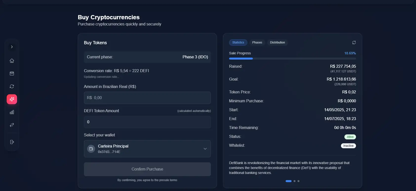DeFi Bank Wallet is a next-generation Web3 banking ecosystem designed to bridge the gap between decentralized finance and traditional banking services. Users can buy crypto with fiat, spend USDT globally, earn from staking and usage-based rewards, and manage all assets from a single, easy-to-use wallet. The ecosystem is powered by the $DBK token, which is currently in presale, giving early adopters a chance to access the platform’s growing utilities at a discounted price.