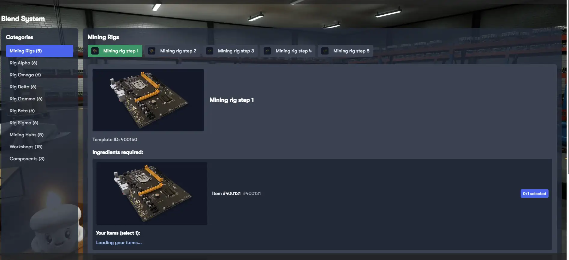 - Acquire Components: Purchase essential NFTs from the in-app shop or marketplaces such as AtomicHub or NFTHive. You’ll need items like processors, GPUs, SSDs, and risers.