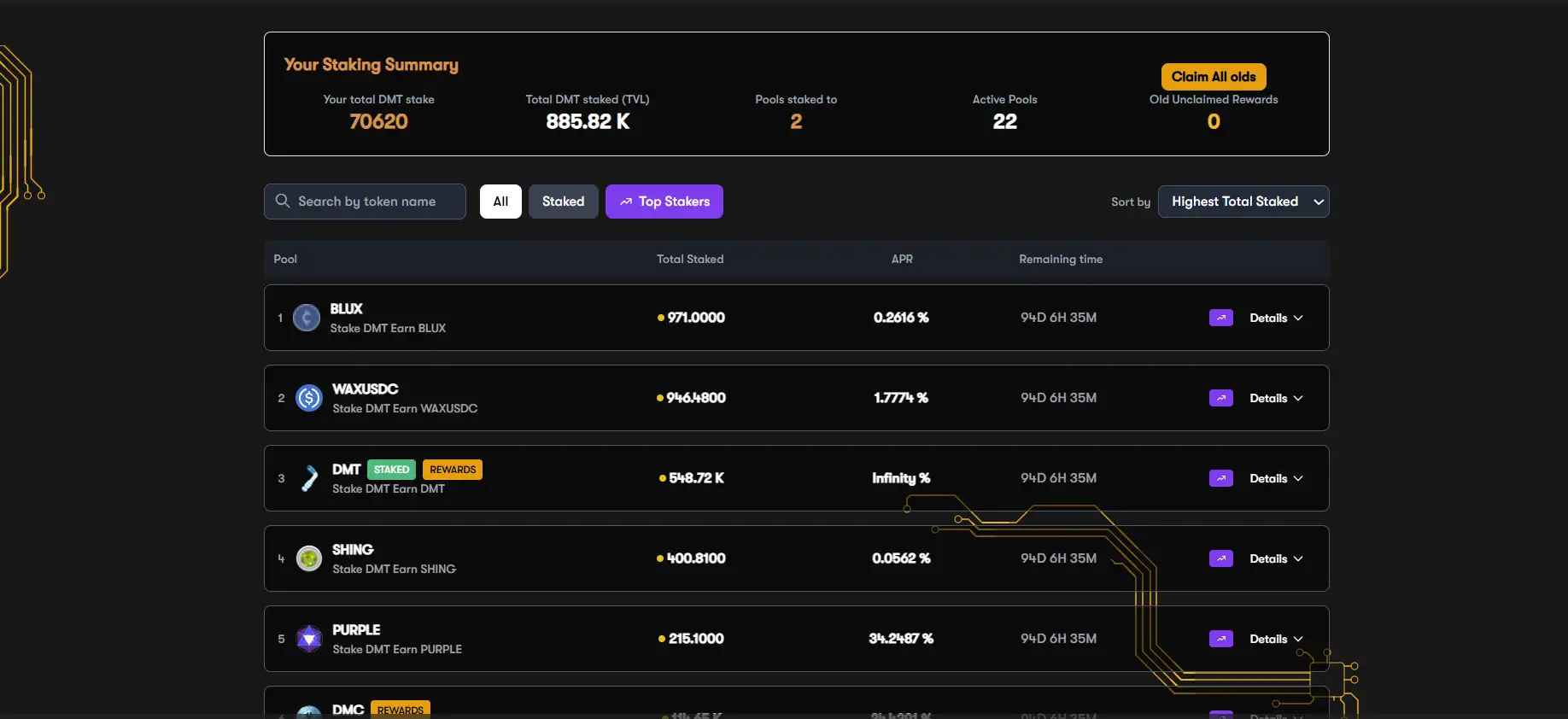 - Token-Based Mining Rewards: Earn DMT, DMC, and DME tokens by staking your mining rigs and maintaining their performance.