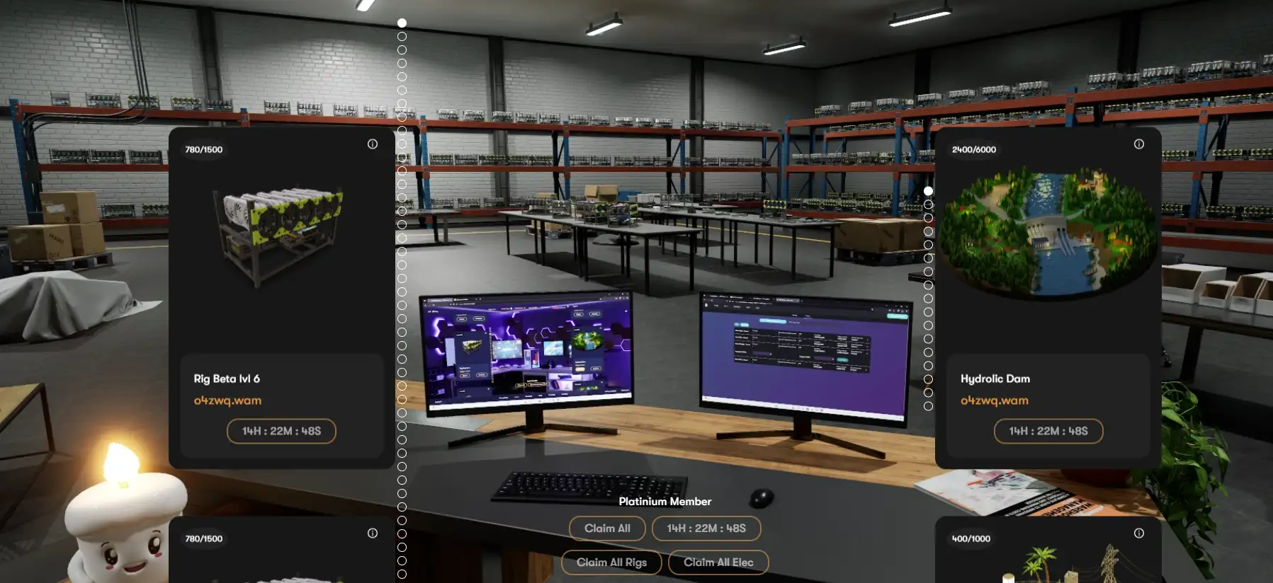 Workshops provide another layer of interaction by letting users manage multiple rigs, optimize outputs, and even repair equipment over time. Users can also stake membership cards to reduce cooldowns and resource consumption while unlocking features like "Claim All." The simulation is enhanced with token integrity and energy systems that govern rig performance and require thoughtful management. These systems are powered by in-game assets such as DMT, DMC, and DME tokens, each serving a distinct purpose in mining operations.