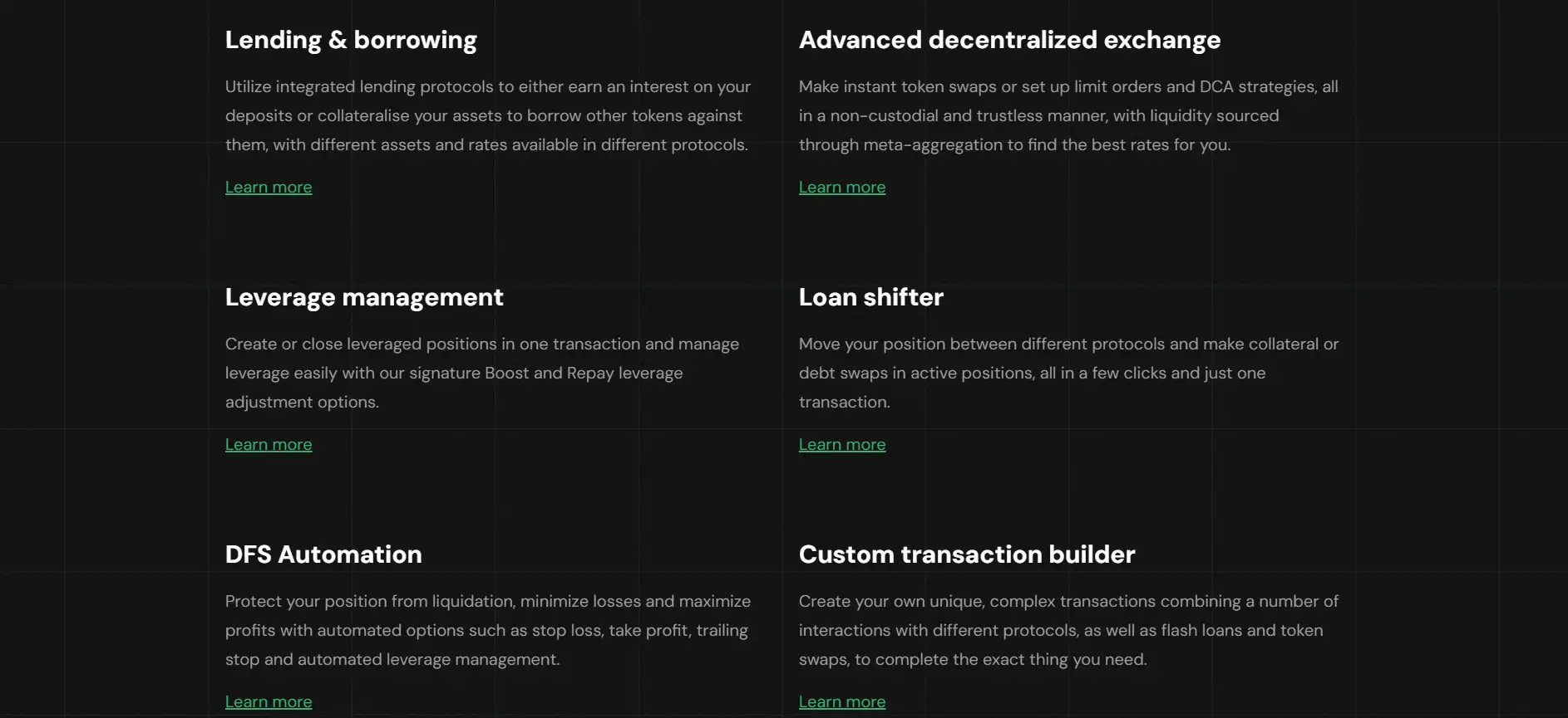 - DFS Automation: Set Stop Loss, Take Profit, Boost, Repay, and Trailing Stop for risk-free hands-off strategy execution.