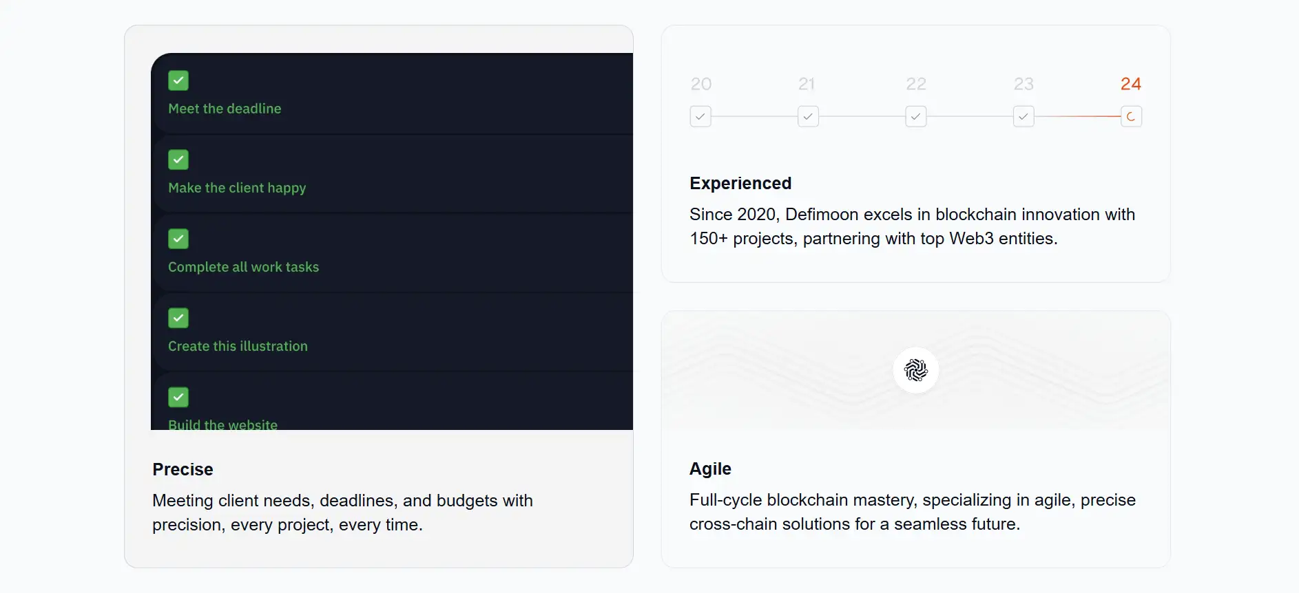 - End-to-End Web3 Services: From smart contract development to DEX platforms and wallet integrations, DeFimoon delivers comprehensive blockchain solutions.