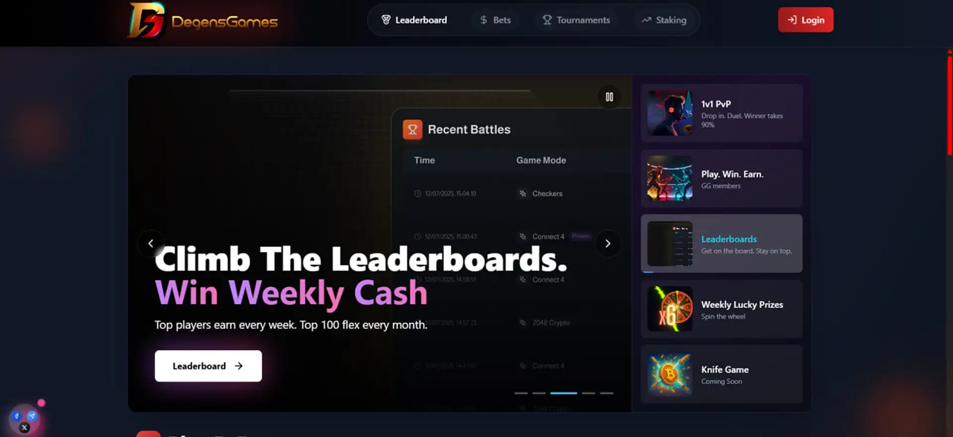 Degens Games is a competitive, skill-based Web3 gaming platform that merges traditional gameplay mechanics with blockchain-powered rewards. Built for high-stakes PvP action, Degens Games puts your skills to the testβoffering instant rewards, real-stakes battles, and AI-powered training to elevate your performance. Whether you're a casual player or a hardcore strategist, every victory matters and every move can earn you real value.